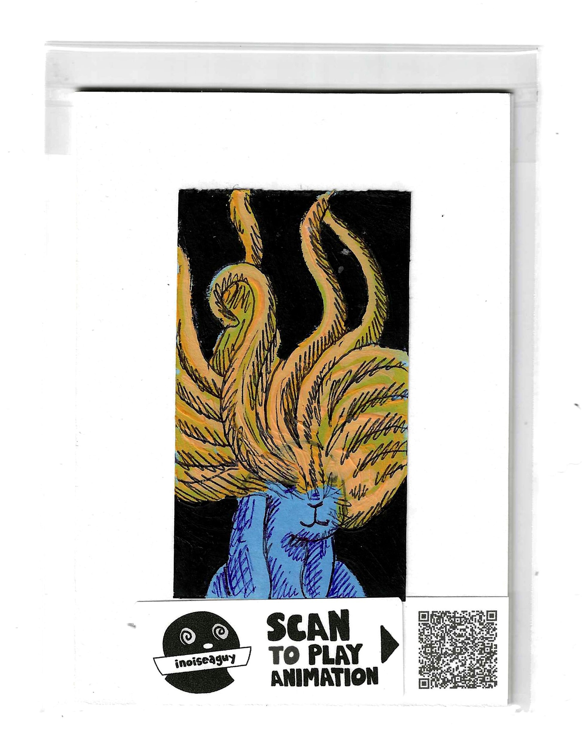 Cel from the traditional animated gif titled, Animals Are Not OK. Published in September 2025 on GIPHY.com. This cel is pasted on a 6"x4.25" matting board and protected by a plastic sleeve. On the sleeve is a label for the businesses social media and a unique QR code for the animation, that when scanned will display the animation on your smartphone. There is also an extra label and QR code inside the small yellow envelope in the cel's gatefold.