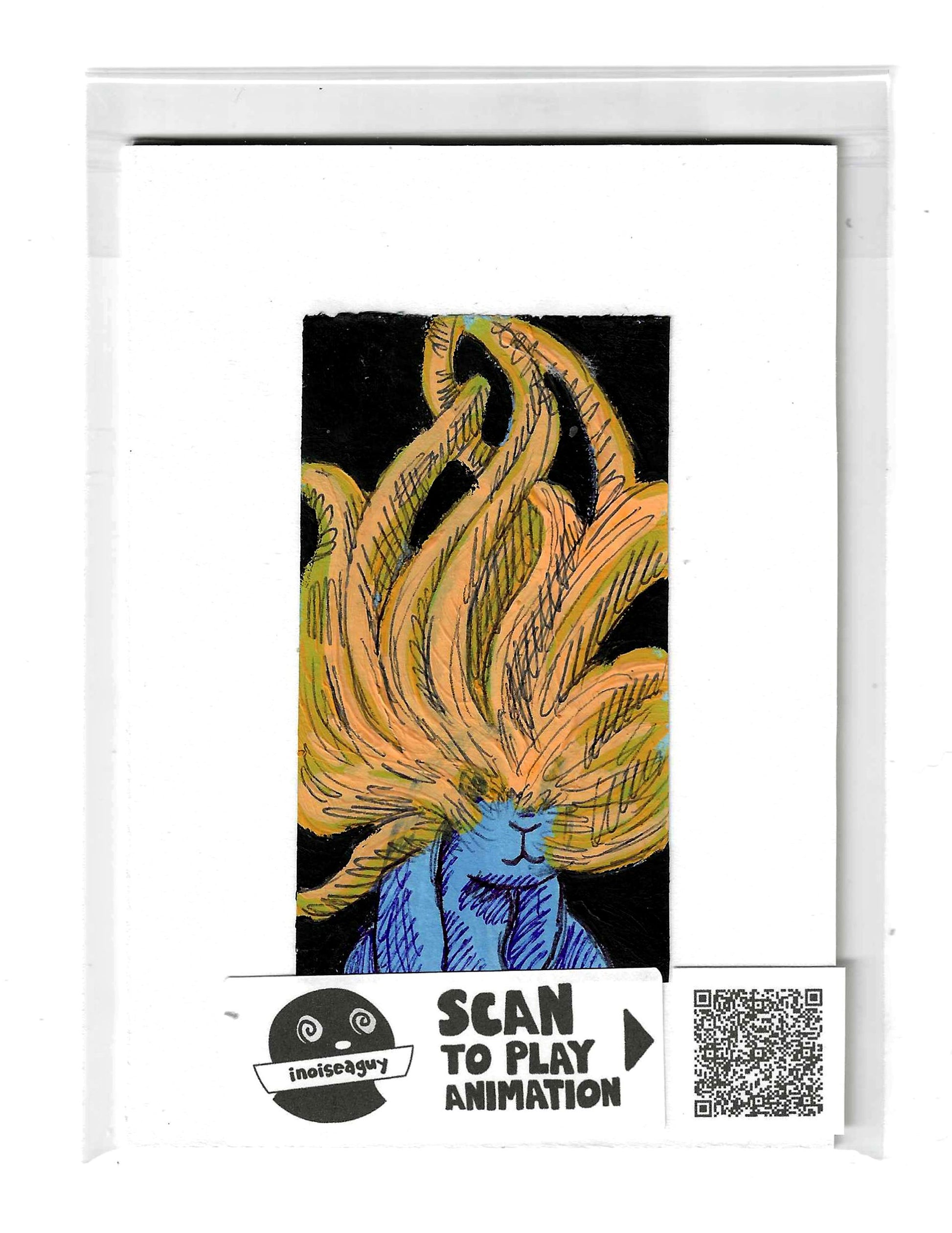 Cel from the traditional animated gif titled, Animals Are Not OK. Published in September 2025 on GIPHY.com. This cel is pasted on a 6"x4.25" matting board and protected by a plastic sleeve. On the sleeve is a label for the businesses social media and a unique QR code for the animation, that when scanned will display the animation on your smartphone. There is also an extra label and QR code inside the small yellow envelope in the cel's gatefold.
