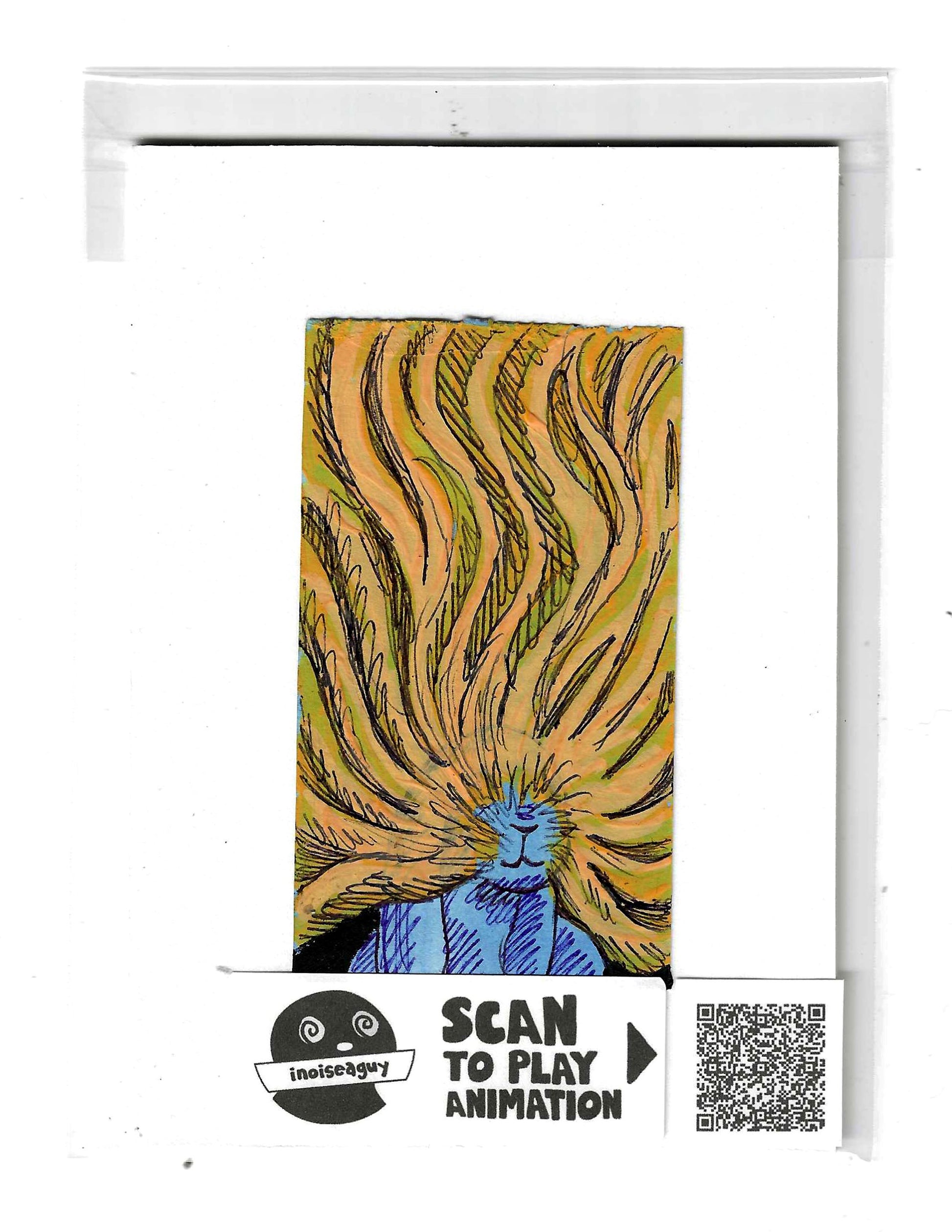 Cel from the traditional animated gif titled, Animals Are Not OK. Published in September 2025 on GIPHY.com. This cel is pasted on a 6"x4.25" matting board and protected by a plastic sleeve. On the sleeve is a label for the businesses social media and a unique QR code for the animation, that when scanned will display the animation on your smartphone. There is also an extra label and QR code inside the small yellow envelope in the cel's gatefold.