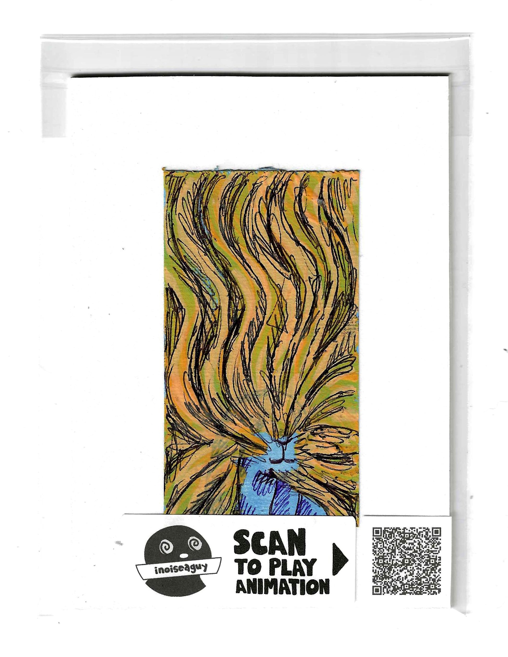 Cel from the traditional animated gif titled, Animals Are Not OK. Published in September 2025 on GIPHY.com. This cel is pasted on a 6"x4.25" matting board and protected by a plastic sleeve. On the sleeve is a label for the businesses social media and a unique QR code for the animation, that when scanned will display the animation on your smartphone. There is also an extra label and QR code inside the small yellow envelope in the cel's gatefold.