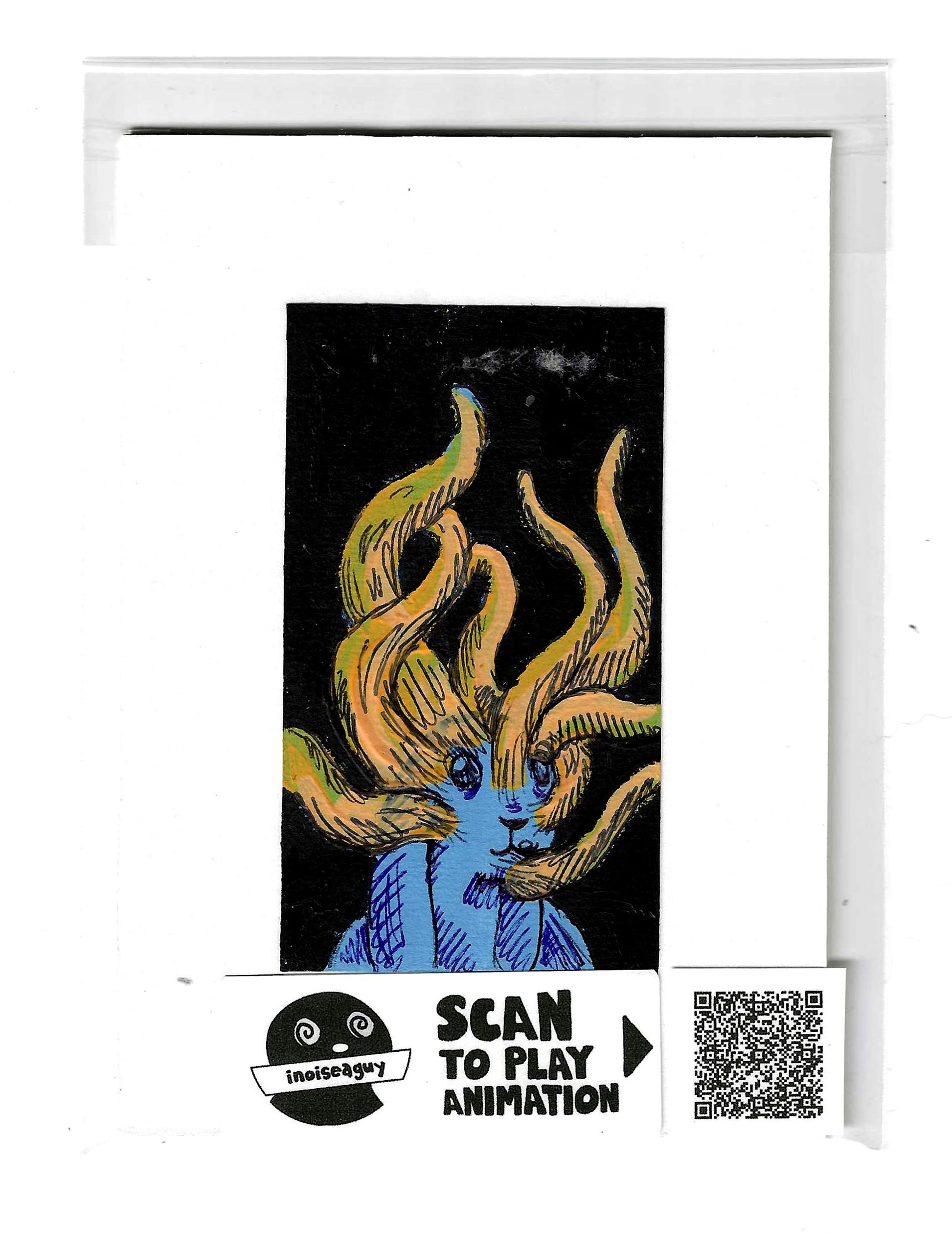 Cel from the traditional animated gif titled, Animals Are Not OK. Published in September 2025 on GIPHY.com. This cel is pasted on a 6"x4.25" matting board and protected by a plastic sleeve. On the sleeve is a label for the businesses social media and a unique QR code for the animation, that when scanned will display the animation on your smartphone. There is also an extra label and QR code inside the small yellow envelope in the cel's gatefold.