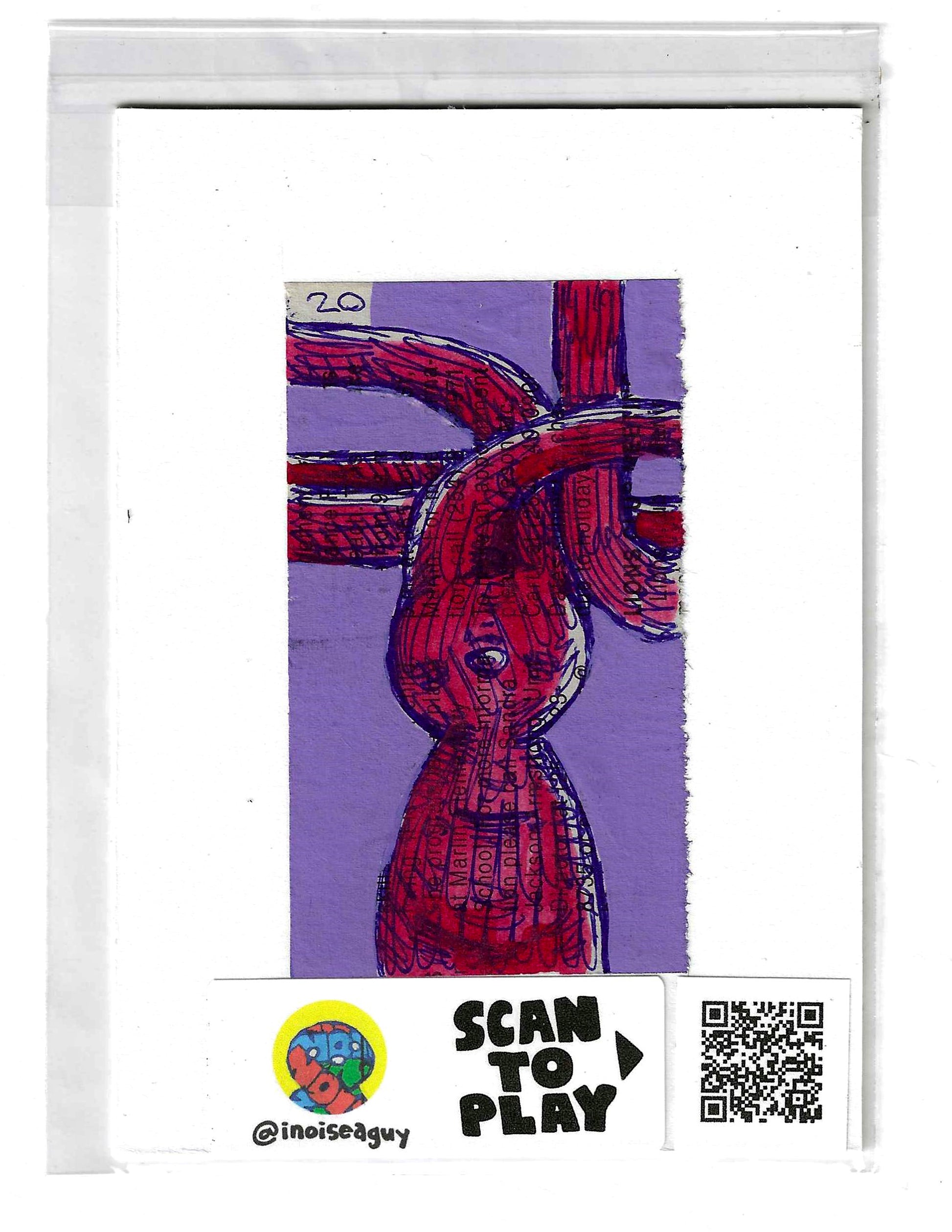 Cel from the traditional animated gif titled, Arrowhead. Published in June 2023 on GIPHY.com. This cel is pasted on a 6"x4.25" matting board and protected by a plastic sleeve. On the sleeve is a label for the businesses social media and a unique QR code for the animation, that when scanned will display the animation on your smartphone.