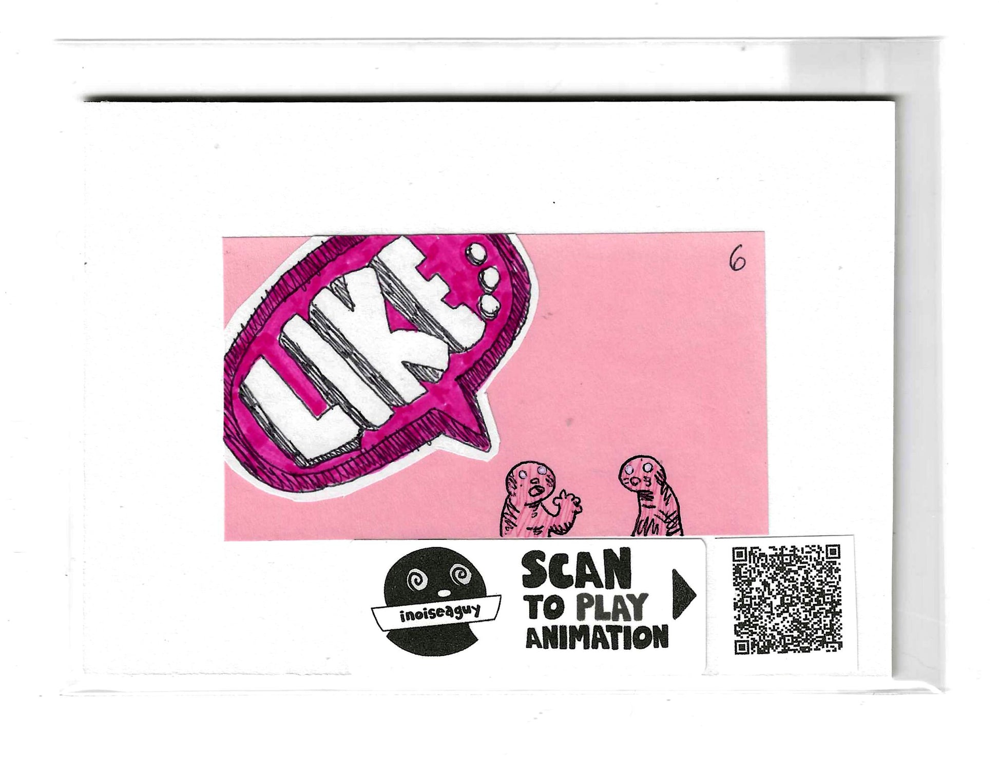 Cel from the traditional animated gif titled, Filler Words. Published in August 2025 on GIPHY.com. This cel is pasted on a 6"x4.25" matting board and protected by a plastic sleeve. On the sleeve is a label for the businesses social media and a unique QR code for the animation, that when scanned will display the animation on your smartphone. There is also an extra label and QR code inside the small yellow envelope in the cel's gatefold.