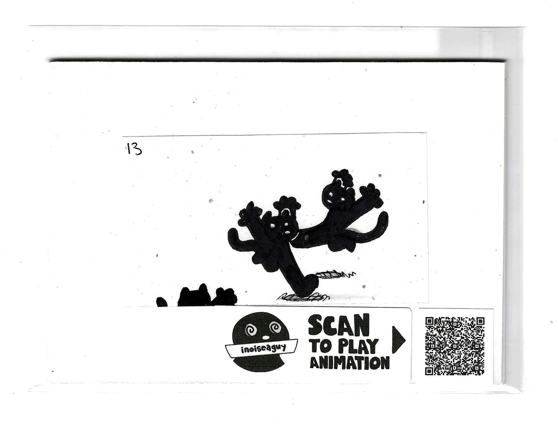 Cel from the traditional animated gif titled, Frantically Scrambling. Published in July 2025 on GIPHY.com. This cel is pasted on a 6"x4.25" matting board and protected by a plastic sleeve. On the sleeve is a label for the businesses social media and a unique QR code for the animation, that when scanned will display the animation on your smartphone. There is also an extra label and QR code inside the small yellow envelope in the cel's gatefold.