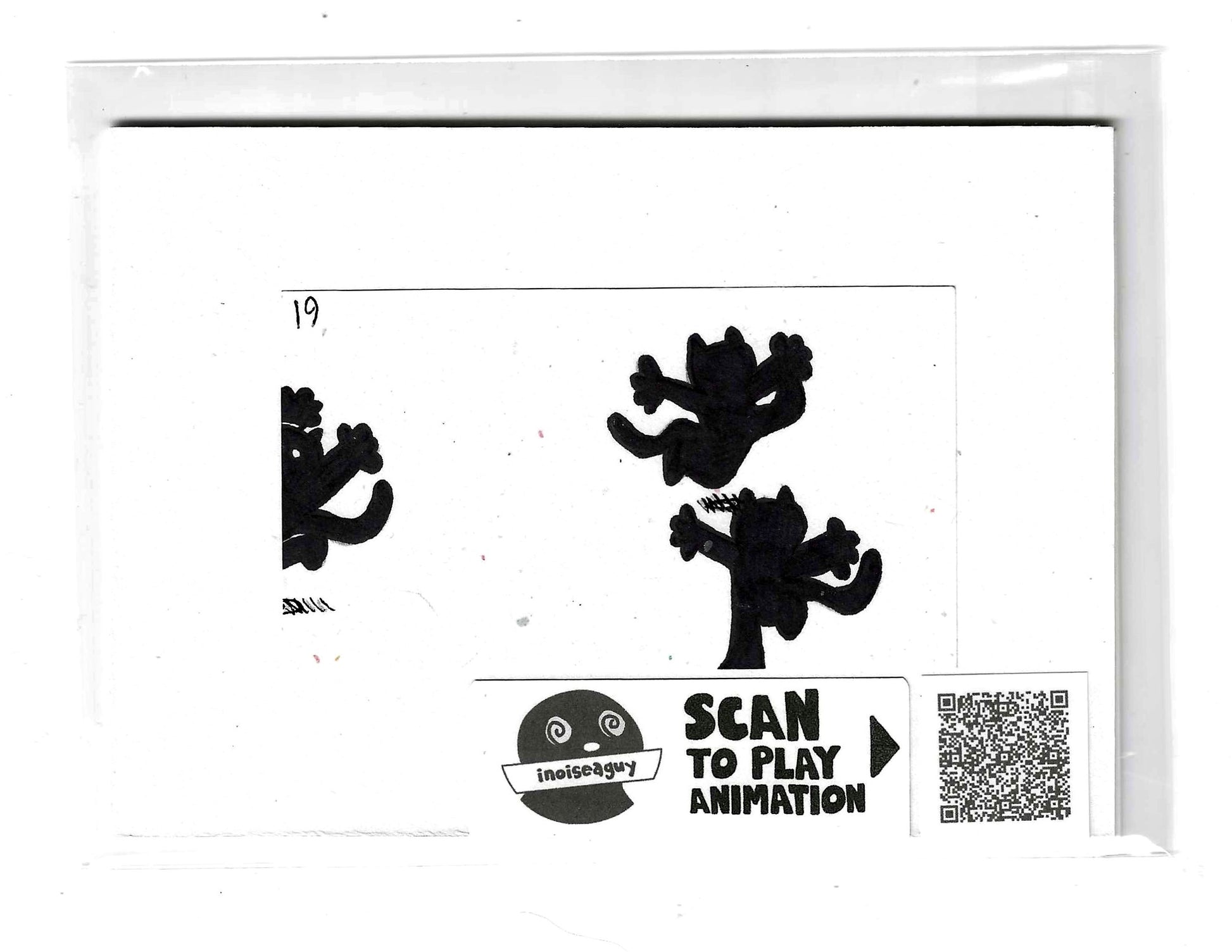 Cel from the traditional animated gif titled, Frantically Scrambling. Published in July 2025 on GIPHY.com. This cel is pasted on a 6"x4.25" matting board and protected by a plastic sleeve. On the sleeve is a label for the businesses social media and a unique QR code for the animation, that when scanned will display the animation on your smartphone. There is also an extra label and QR code inside the small yellow envelope in the cel's gatefold.