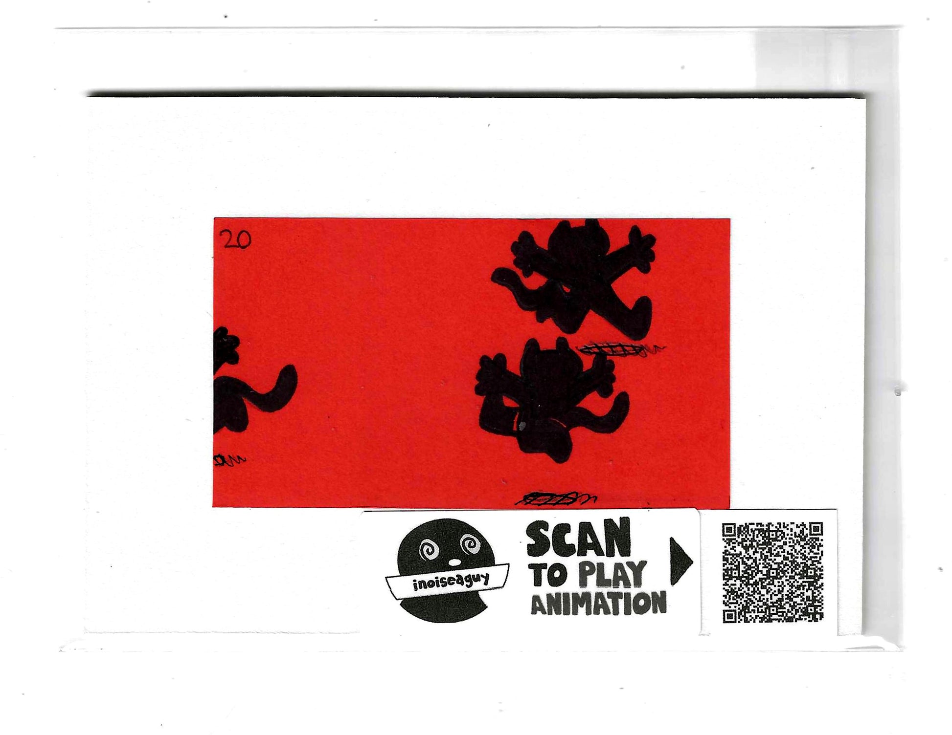 Cel from the traditional animated gif titled, Frantically Scrambling. Published in July 2025 on GIPHY.com. This cel is pasted on a 6"x4.25" matting board and protected by a plastic sleeve. On the sleeve is a label for the businesses social media and a unique QR code for the animation, that when scanned will display the animation on your smartphone. There is also an extra label and QR code inside the small yellow envelope in the cel's gatefold.