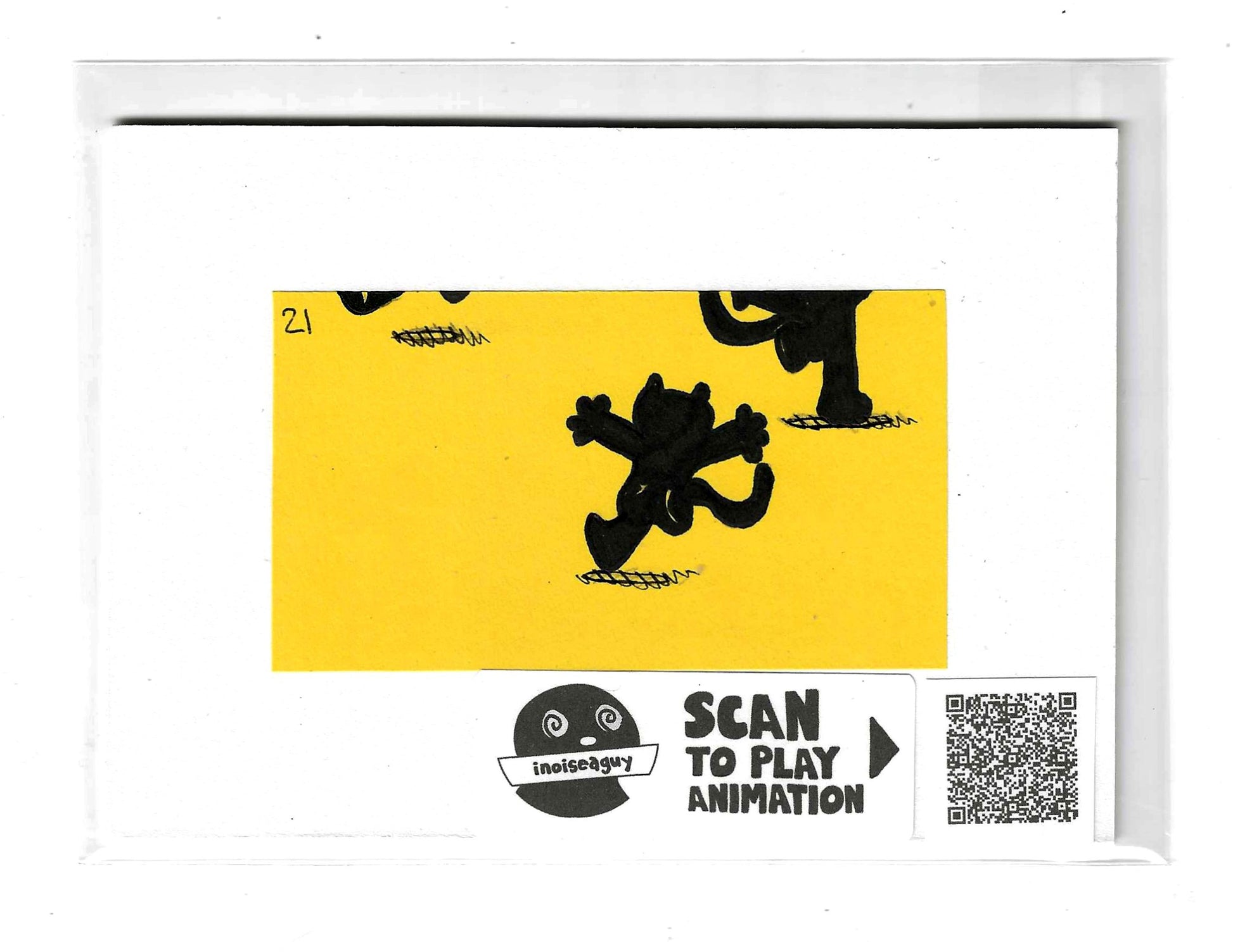 Cel from the traditional animated gif titled, Frantically Scrambling. Published in July 2025 on GIPHY.com. This cel is pasted on a 6"x4.25" matting board and protected by a plastic sleeve. On the sleeve is a label for the businesses social media and a unique QR code for the animation, that when scanned will display the animation on your smartphone. There is also an extra label and QR code inside the small yellow envelope in the cel's gatefold.