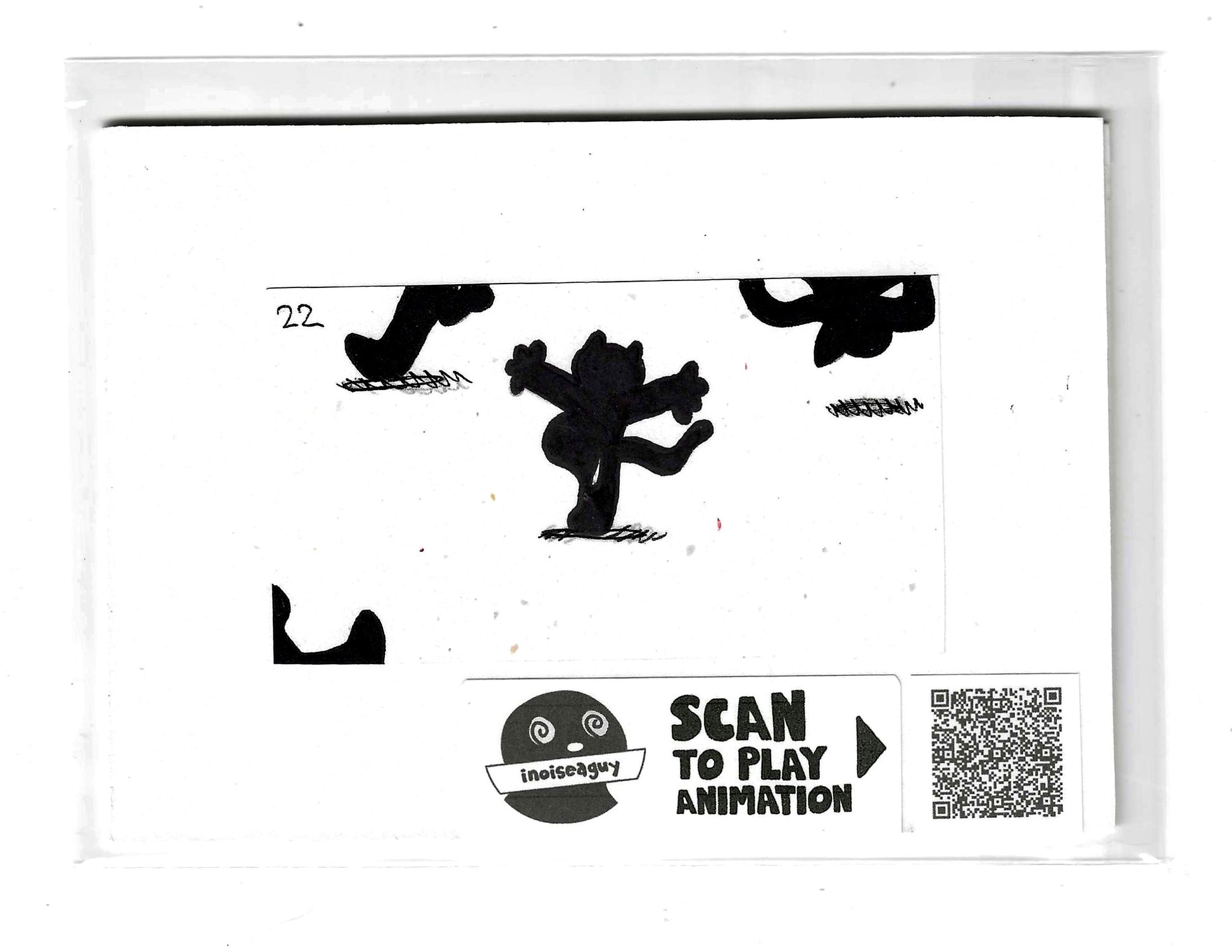 Cel from the traditional animated gif titled, Frantically Scrambling. Published in July 2025 on GIPHY.com. This cel is pasted on a 6"x4.25" matting board and protected by a plastic sleeve. On the sleeve is a label for the businesses social media and a unique QR code for the animation, that when scanned will display the animation on your smartphone. There is also an extra label and QR code inside the small yellow envelope in the cel's gatefold.