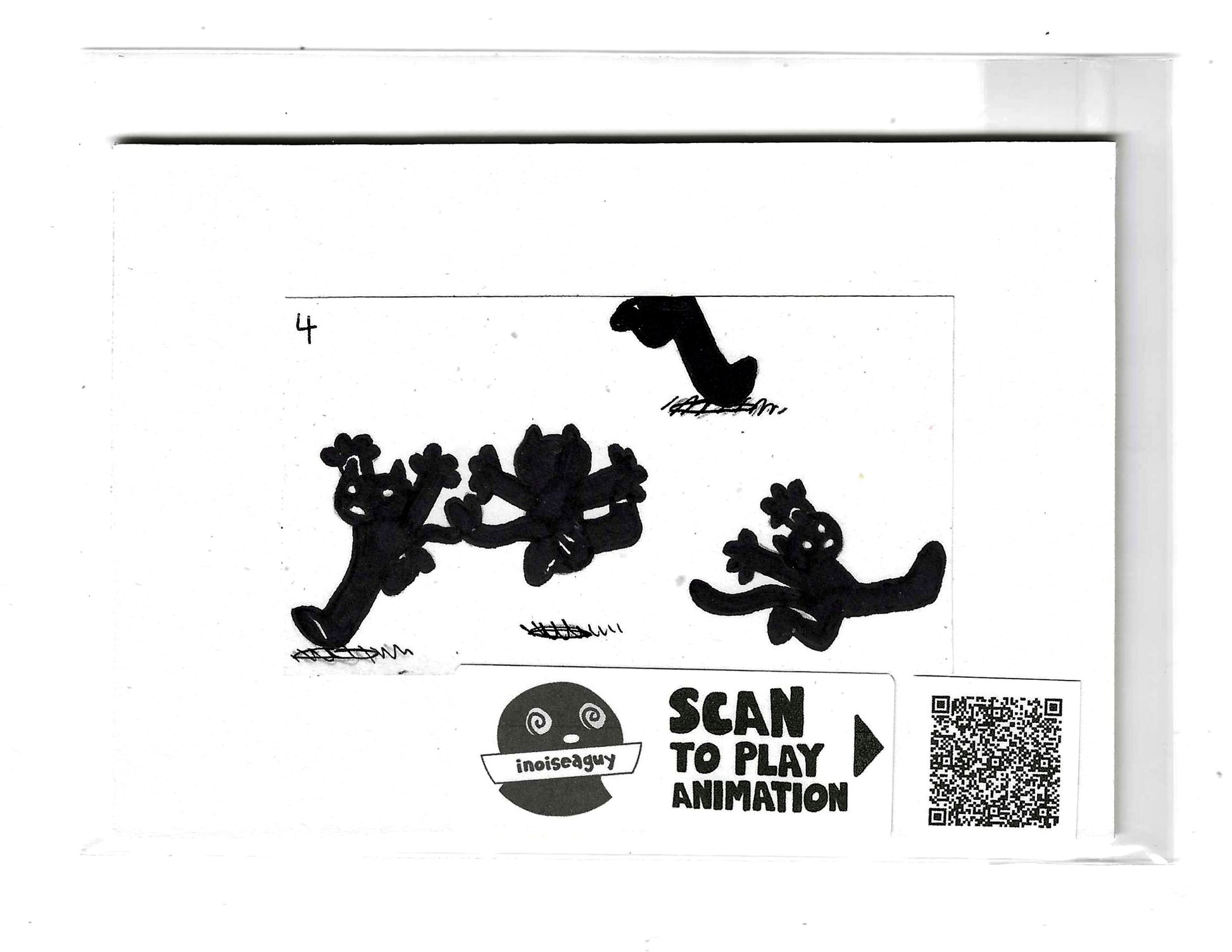 Cel from the traditional animated gif titled, Frantically Scrambling. Published in July 2025 on GIPHY.com. This cel is pasted on a 6"x4.25" matting board and protected by a plastic sleeve. On the sleeve is a label for the businesses social media and a unique QR code for the animation, that when scanned will display the animation on your smartphone. There is also an extra label and QR code inside the small yellow envelope in the cel's gatefold.