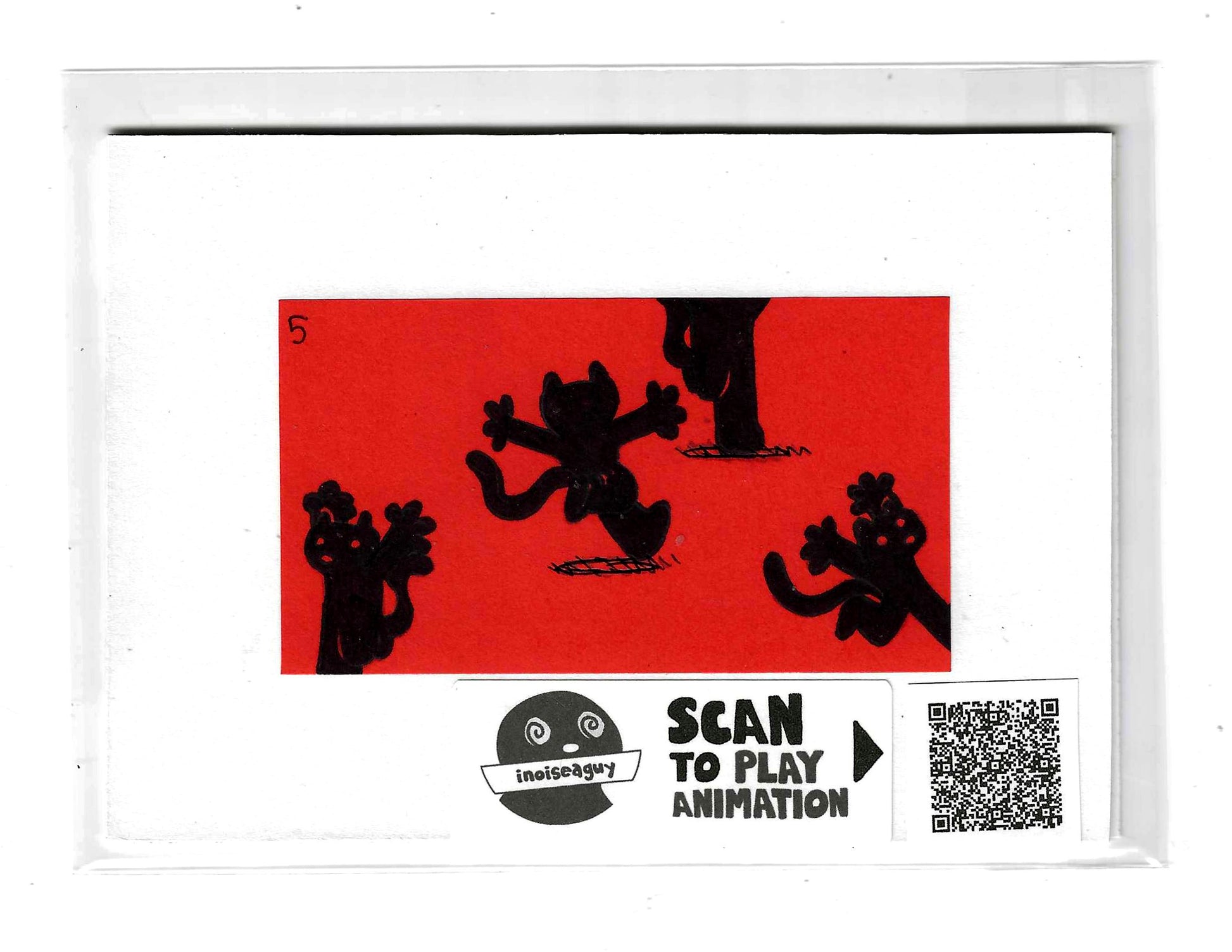 Cel from the traditional animated gif titled, Frantically Scrambling. Published in July 2025 on GIPHY.com. This cel is pasted on a 6"x4.25" matting board and protected by a plastic sleeve. On the sleeve is a label for the businesses social media and a unique QR code for the animation, that when scanned will display the animation on your smartphone. There is also an extra label and QR code inside the small yellow envelope in the cel's gatefold.
