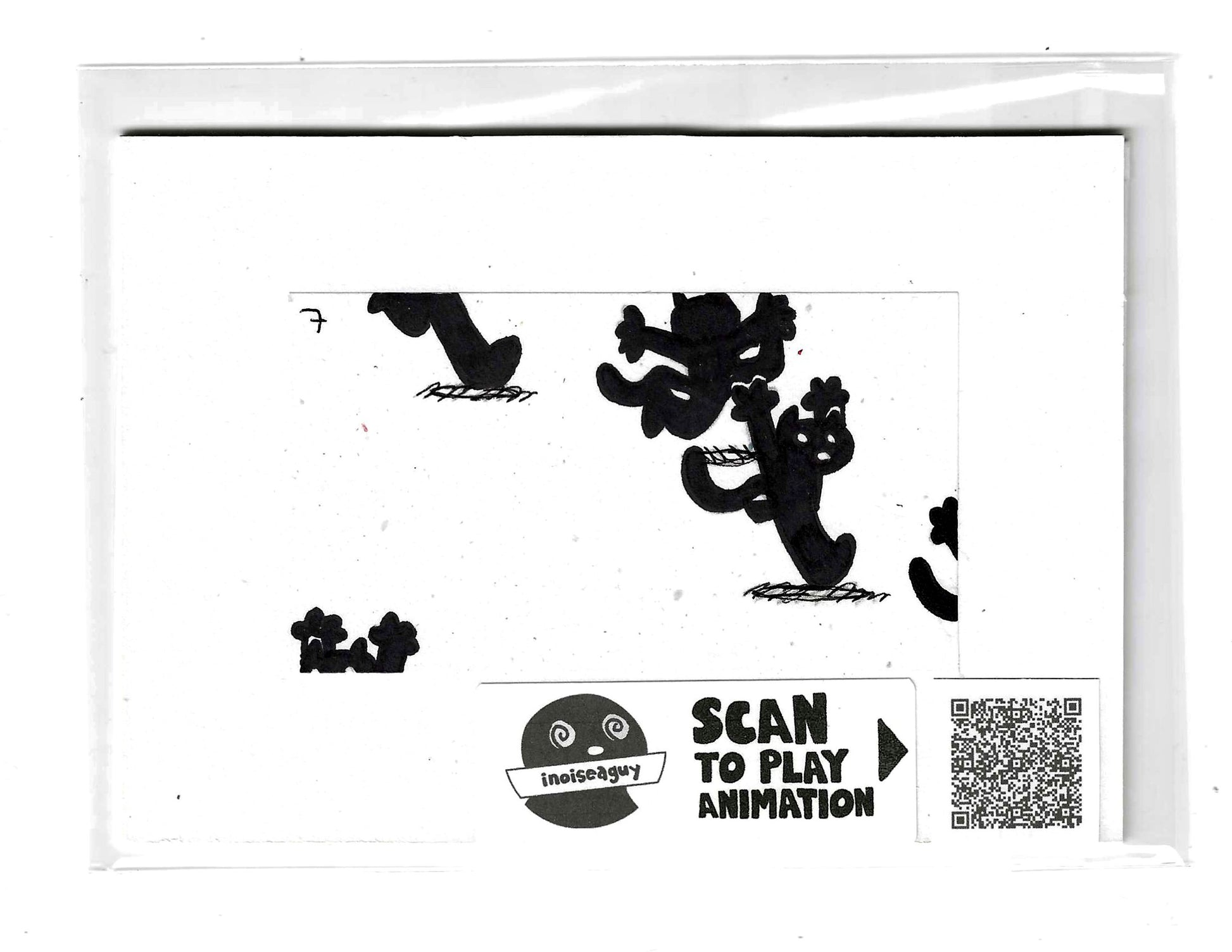 Cel from the traditional animated gif titled, Frantically Scrambling. Published in July 2025 on GIPHY.com. This cel is pasted on a 6"x4.25" matting board and protected by a plastic sleeve. On the sleeve is a label for the businesses social media and a unique QR code for the animation, that when scanned will display the animation on your smartphone. There is also an extra label and QR code inside the small yellow envelope in the cel's gatefold.