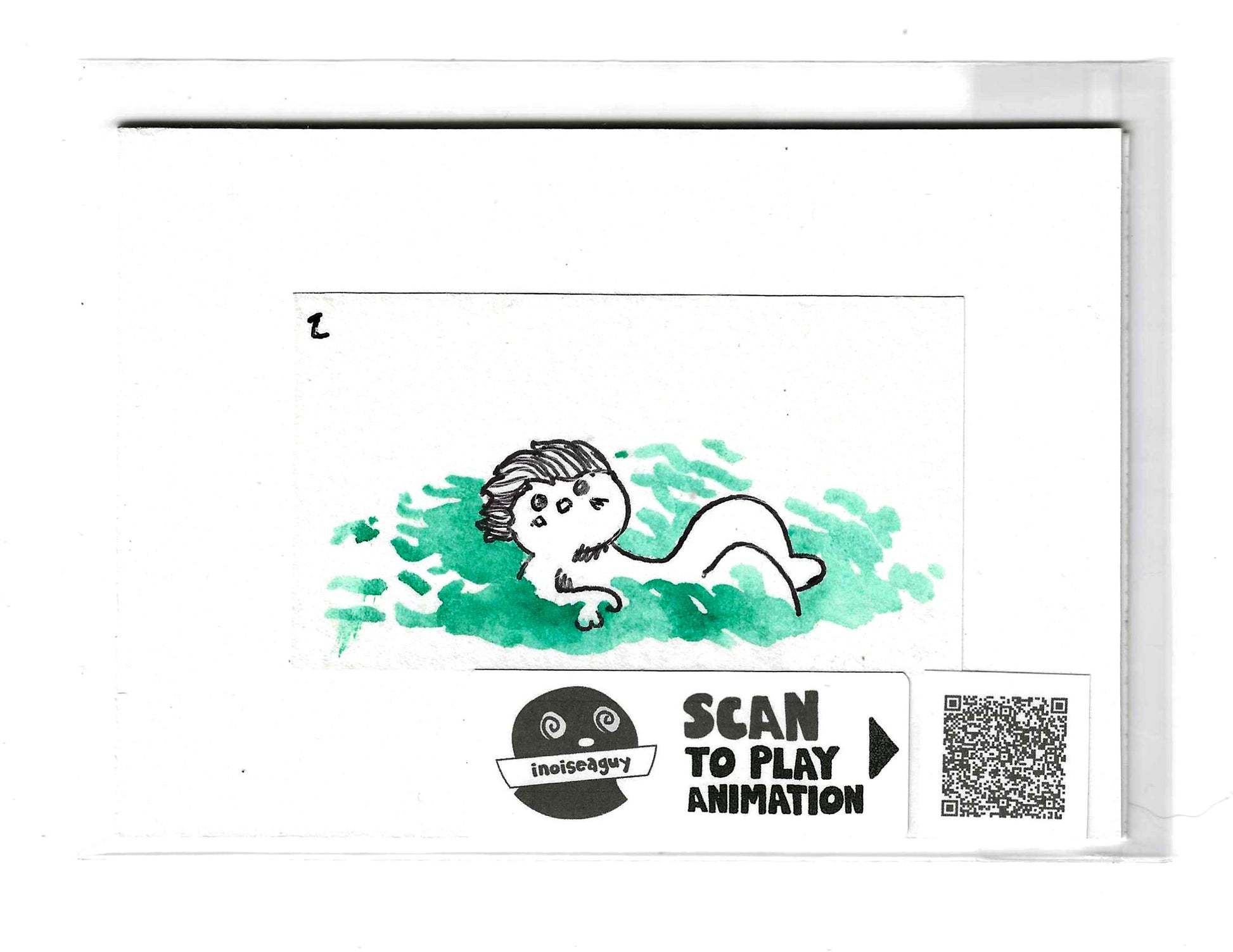 Cel from the traditional animated gif titled, Grass. Published in October 2025 on GIPHY.com. This cel is pasted on a 6"x4.25" matting board and protected by a plastic sleeve. On the sleeve is a label for the businesses social media and a unique QR code for the animation, that when scanned will display the animation on your smartphone. There is also an extra label and QR code inside the small yellow envelope in the cel's gatefold.