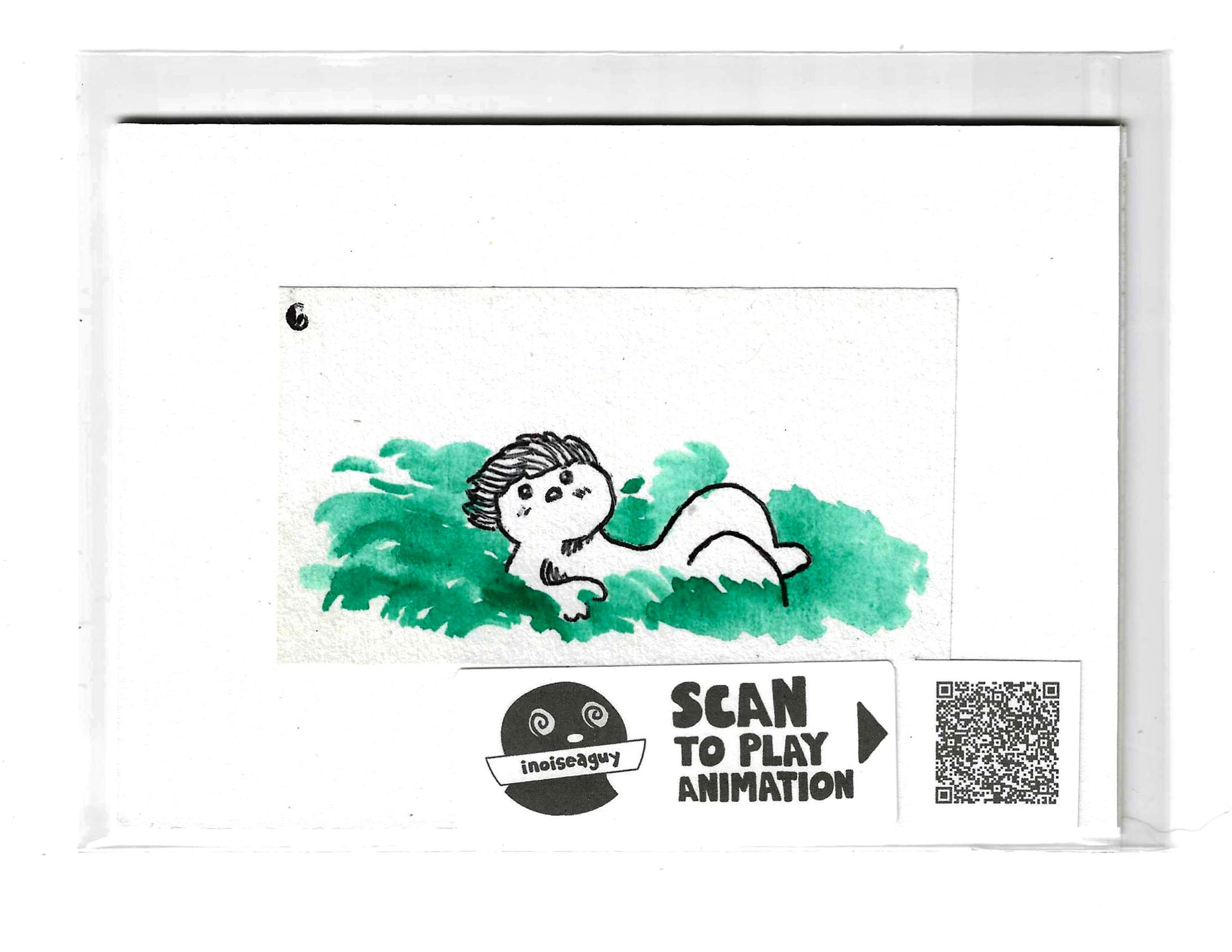 Cel from the traditional animated gif titled, Grass. Published in October 2025 on GIPHY.com. This cel is pasted on a 6"x4.25" matting board and protected by a plastic sleeve. On the sleeve is a label for the businesses social media and a unique QR code for the animation, that when scanned will display the animation on your smartphone. There is also an extra label and QR code inside the small yellow envelope in the cel's gatefold.