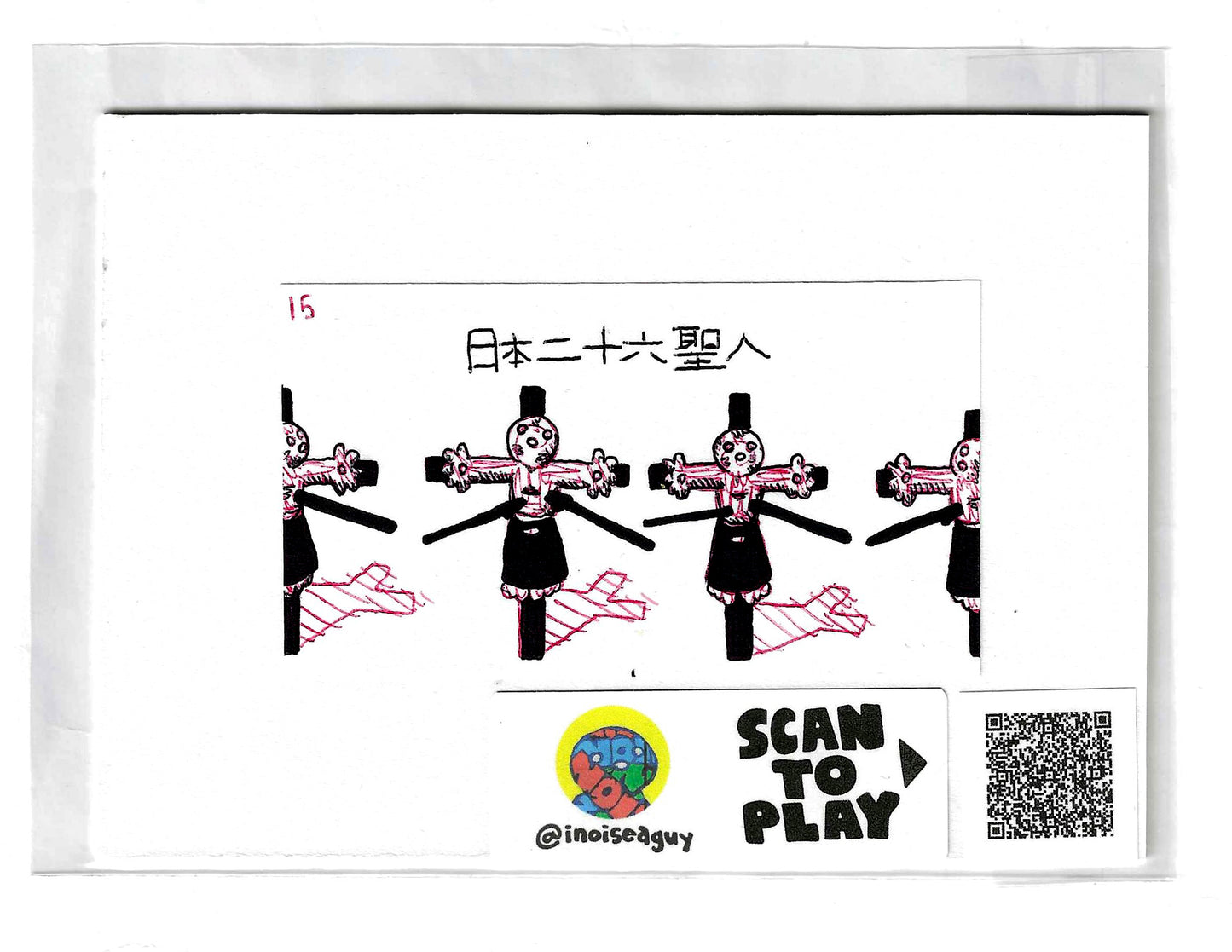 Cel from the traditional animated gif titled, Japanese Martyrs. Published in February 2023 on GIPHY.com. This cel is pasted on a 6"x4.25" matting board and protected by a plastic sleeve. On the sleeve is a label for the businesses social media and a unique QR code for the animation, that when scanned will display the animation on your smartphone.