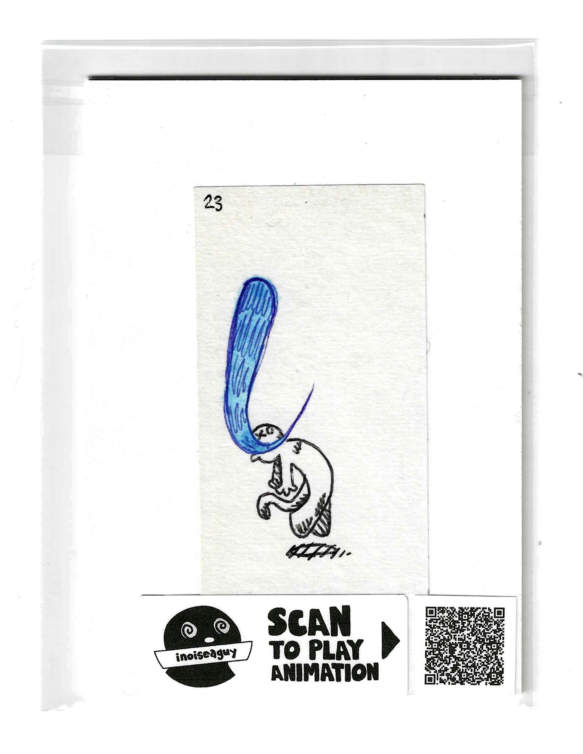 Cel from the traditional animated gif titled, Kissing Soul. Published in November 2025 on GIPHY.com. This cel is pasted on a 6"x4.25" matting board and protected by a plastic sleeve. On the sleeve is a label for the businesses social media and a unique QR code for the animation, that when scanned will display the animation on your smartphone. There is also an extra label and QR code inside the small yellow envelope in the cel's gatefold.