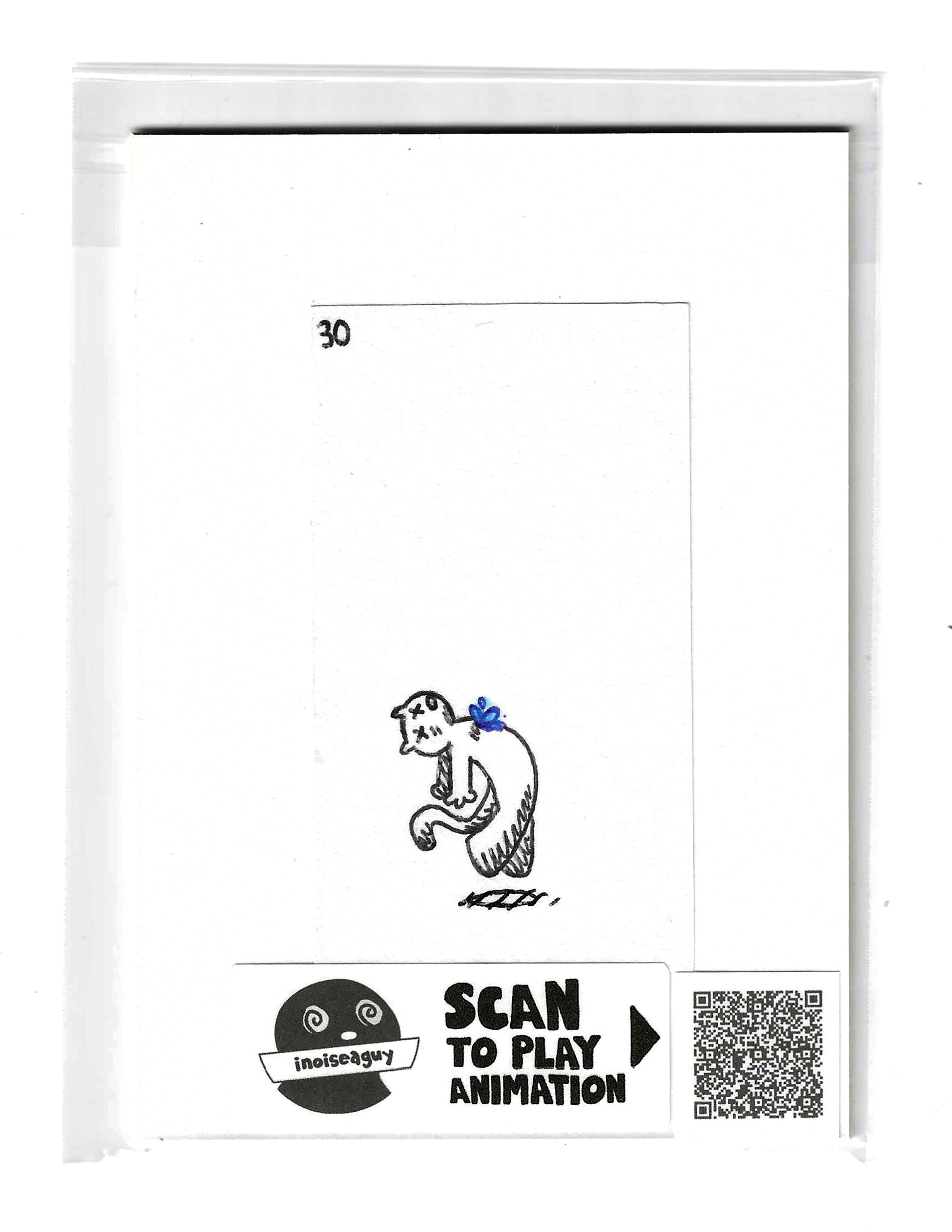 Cel from the traditional animated gif titled, Kissing Soul. Published in November 2025 on GIPHY.com. This cel is pasted on a 6"x4.25" matting board and protected by a plastic sleeve. On the sleeve is a label for the businesses social media and a unique QR code for the animation, that when scanned will display the animation on your smartphone. There is also an extra label and QR code inside the small yellow envelope in the cel's gatefold.