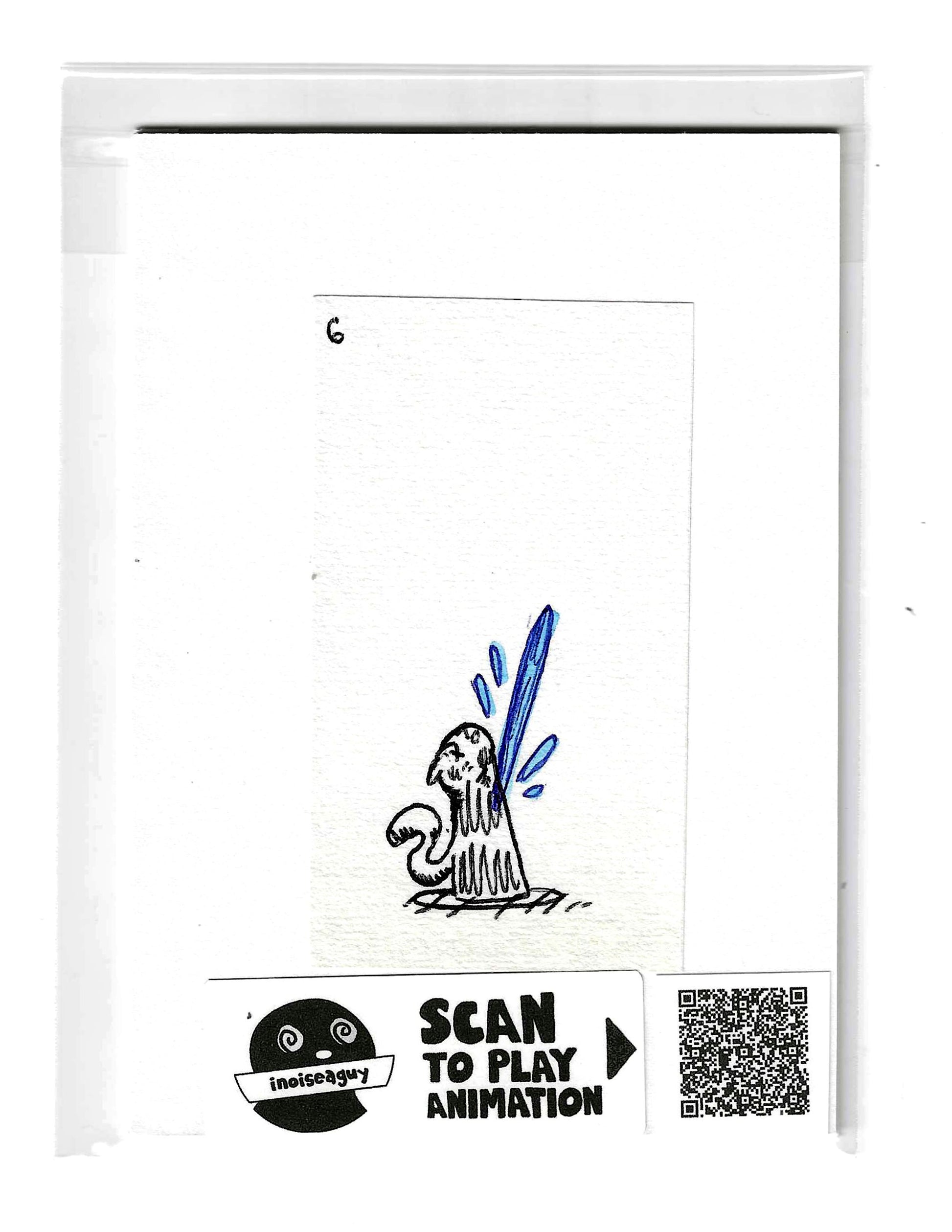 Cel from the traditional animated gif titled, Kissing Soul. Published in November 2025 on GIPHY.com. This cel is pasted on a 6"x4.25" matting board and protected by a plastic sleeve. On the sleeve is a label for the businesses social media and a unique QR code for the animation, that when scanned will display the animation on your smartphone. There is also an extra label and QR code inside the small yellow envelope in the cel's gatefold.