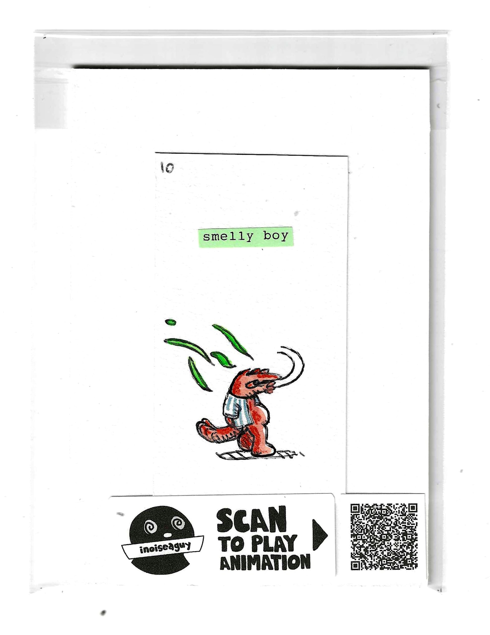 Cel from the traditional animated gif titled, Smelly Boy. Published in June 2025 on GIPHY.com. This cel is pasted on a 6"x4.25" matting board and protected by a plastic sleeve. On the sleeve is a label for the businesses social media and a unique QR code for the animation, that when scanned will display the animation on your smartphone. There is also an extra label and QR code inside the small yellow envelope in the cel's gatefold.