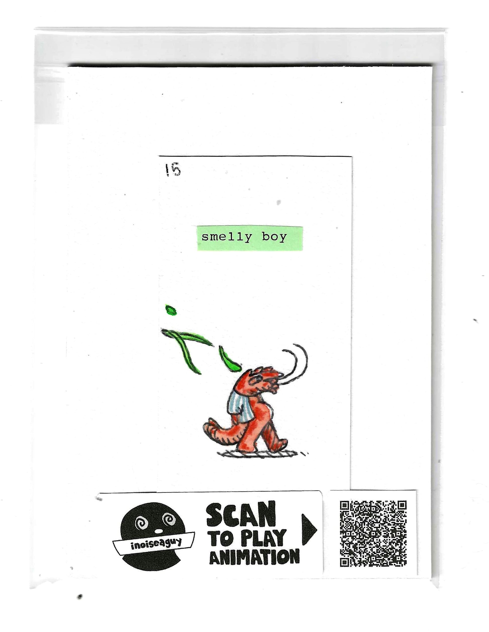 Cel from the traditional animated gif titled, Smelly Boy. Published in June 2025 on GIPHY.com. This cel is pasted on a 6"x4.25" matting board and protected by a plastic sleeve. On the sleeve is a label for the businesses social media and a unique QR code for the animation, that when scanned will display the animation on your smartphone. There is also an extra label and QR code inside the small yellow envelope in the cel's gatefold.