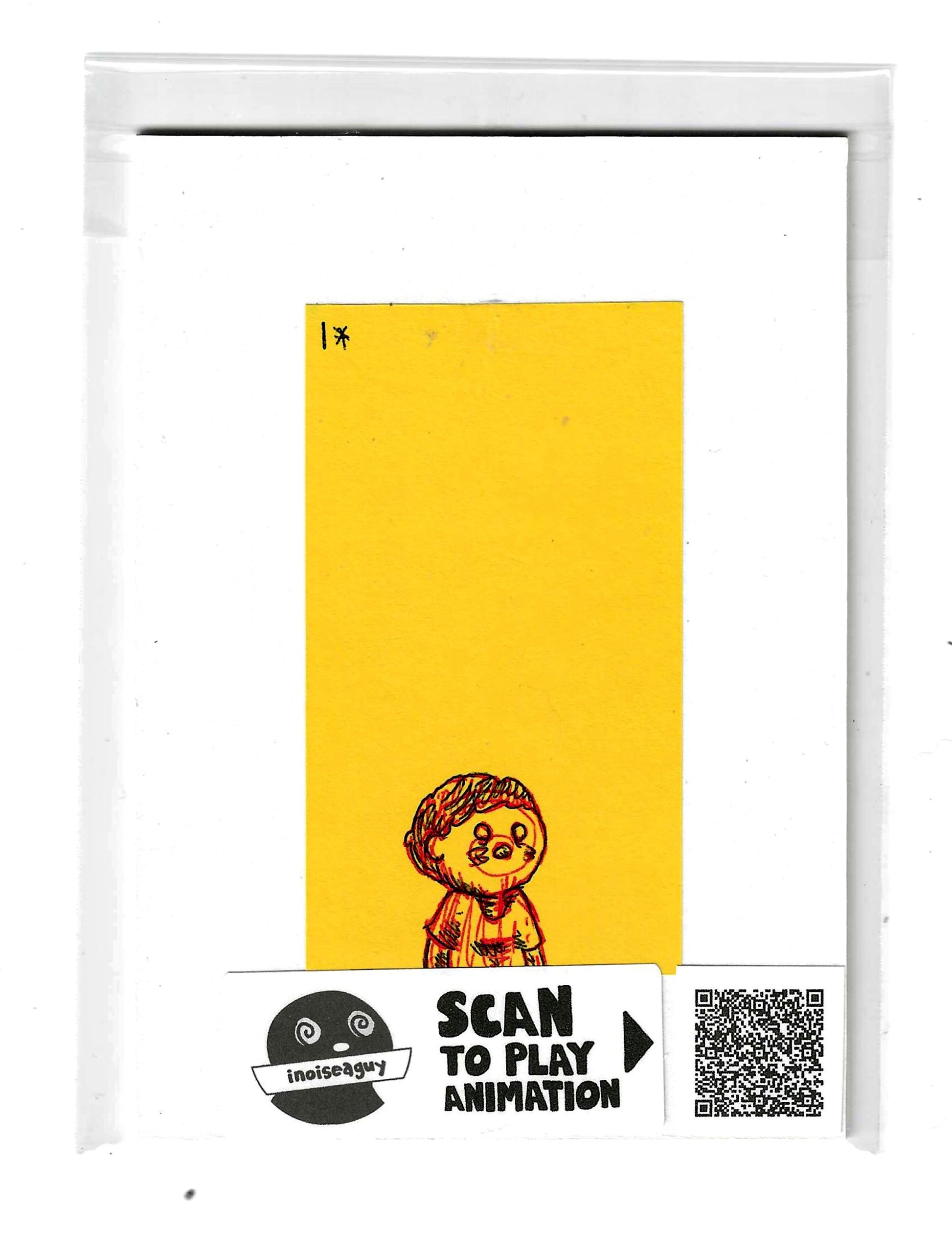 Cel from the traditional animated gif titled, Spicy Ramen Burps. Published in October 2025 on GIPHY.com. This cel is pasted on a 6"x4.25" matting board and protected by a plastic sleeve. On the sleeve is a label for the businesses social media and a unique QR code for the animation, that when scanned will display the animation on your smartphone. There is also an extra label and QR code inside the small yellow envelope in the cel's gatefold.