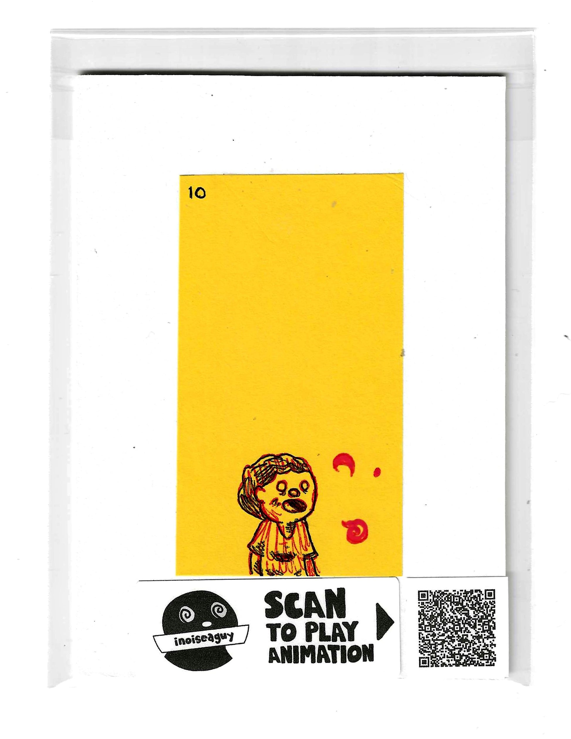 Cel from the traditional animated gif titled, Spicy Ramen Burps. Published in October 2025 on GIPHY.com. This cel is pasted on a 6"x4.25" matting board and protected by a plastic sleeve. On the sleeve is a label for the businesses social media and a unique QR code for the animation, that when scanned will display the animation on your smartphone. There is also an extra label and QR code inside the small yellow envelope in the cel's gatefold.