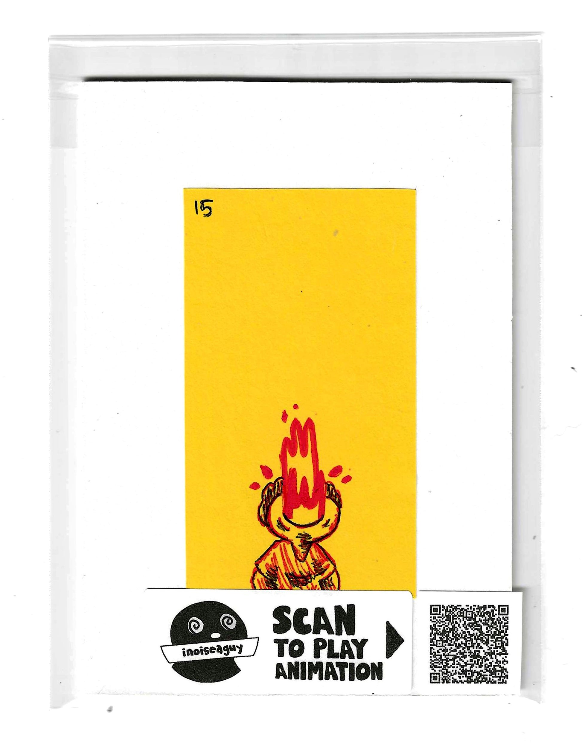 Cel from the traditional animated gif titled, Spicy Ramen Burps. Published in October 2025 on GIPHY.com. This cel is pasted on a 6"x4.25" matting board and protected by a plastic sleeve. On the sleeve is a label for the businesses social media and a unique QR code for the animation, that when scanned will display the animation on your smartphone. There is also an extra label and QR code inside the small yellow envelope in the cel's gatefold.