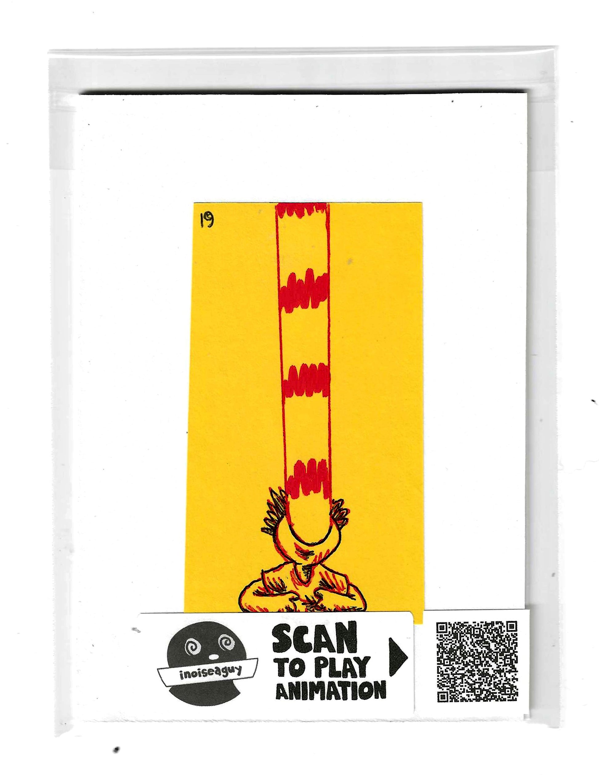 Cel from the traditional animated gif titled, Spicy Ramen Burps. Published in October 2025 on GIPHY.com. This cel is pasted on a 6"x4.25" matting board and protected by a plastic sleeve. On the sleeve is a label for the businesses social media and a unique QR code for the animation, that when scanned will display the animation on your smartphone. There is also an extra label and QR code inside the small yellow envelope in the cel's gatefold.