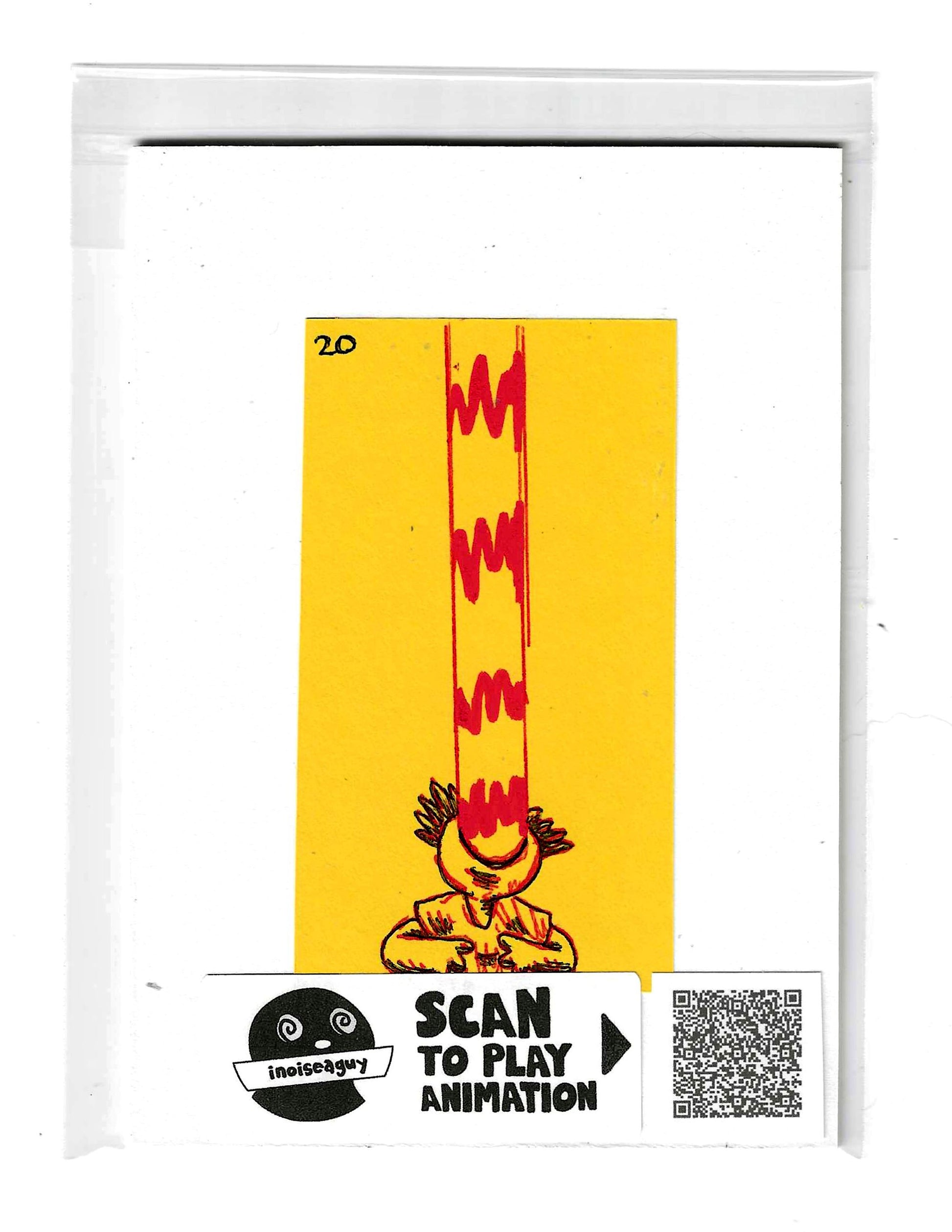 Cel from the traditional animated gif titled, Spicy Ramen Burps. Published in October 2025 on GIPHY.com. This cel is pasted on a 6"x4.25" matting board and protected by a plastic sleeve. On the sleeve is a label for the businesses social media and a unique QR code for the animation, that when scanned will display the animation on your smartphone. There is also an extra label and QR code inside the small yellow envelope in the cel's gatefold.