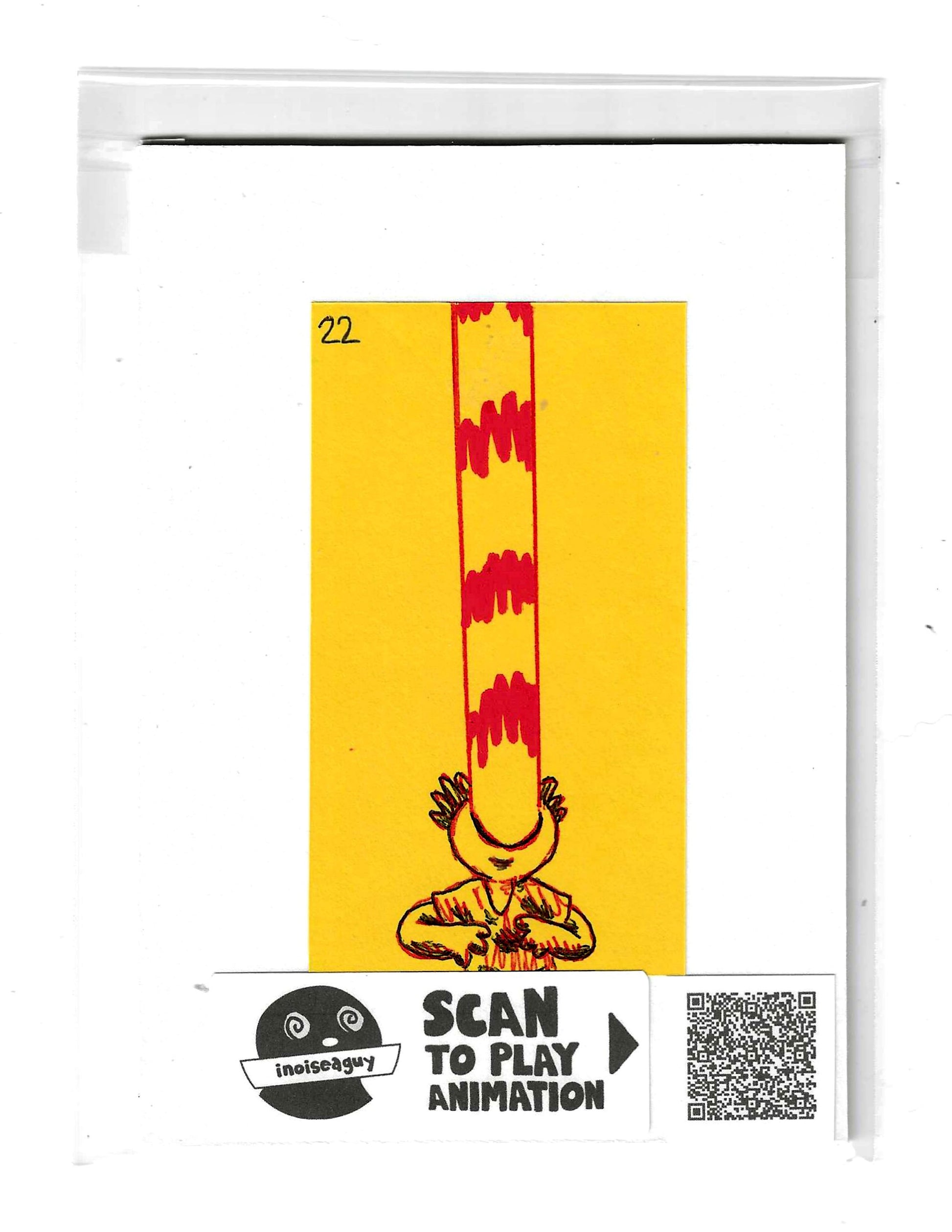Cel from the traditional animated gif titled, Spicy Ramen Burps. Published in October 2025 on GIPHY.com. This cel is pasted on a 6"x4.25" matting board and protected by a plastic sleeve. On the sleeve is a label for the businesses social media and a unique QR code for the animation, that when scanned will display the animation on your smartphone. There is also an extra label and QR code inside the small yellow envelope in the cel's gatefold.
