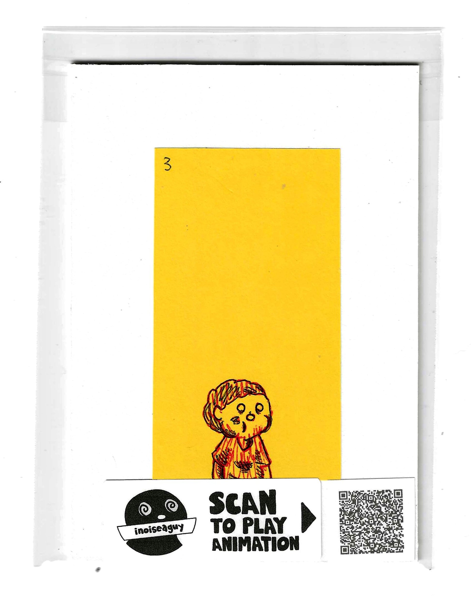 Cel from the traditional animated gif titled, Spicy Ramen Burps. Published in October 2025 on GIPHY.com. This cel is pasted on a 6"x4.25" matting board and protected by a plastic sleeve. On the sleeve is a label for the businesses social media and a unique QR code for the animation, that when scanned will display the animation on your smartphone. There is also an extra label and QR code inside the small yellow envelope in the cel's gatefold.