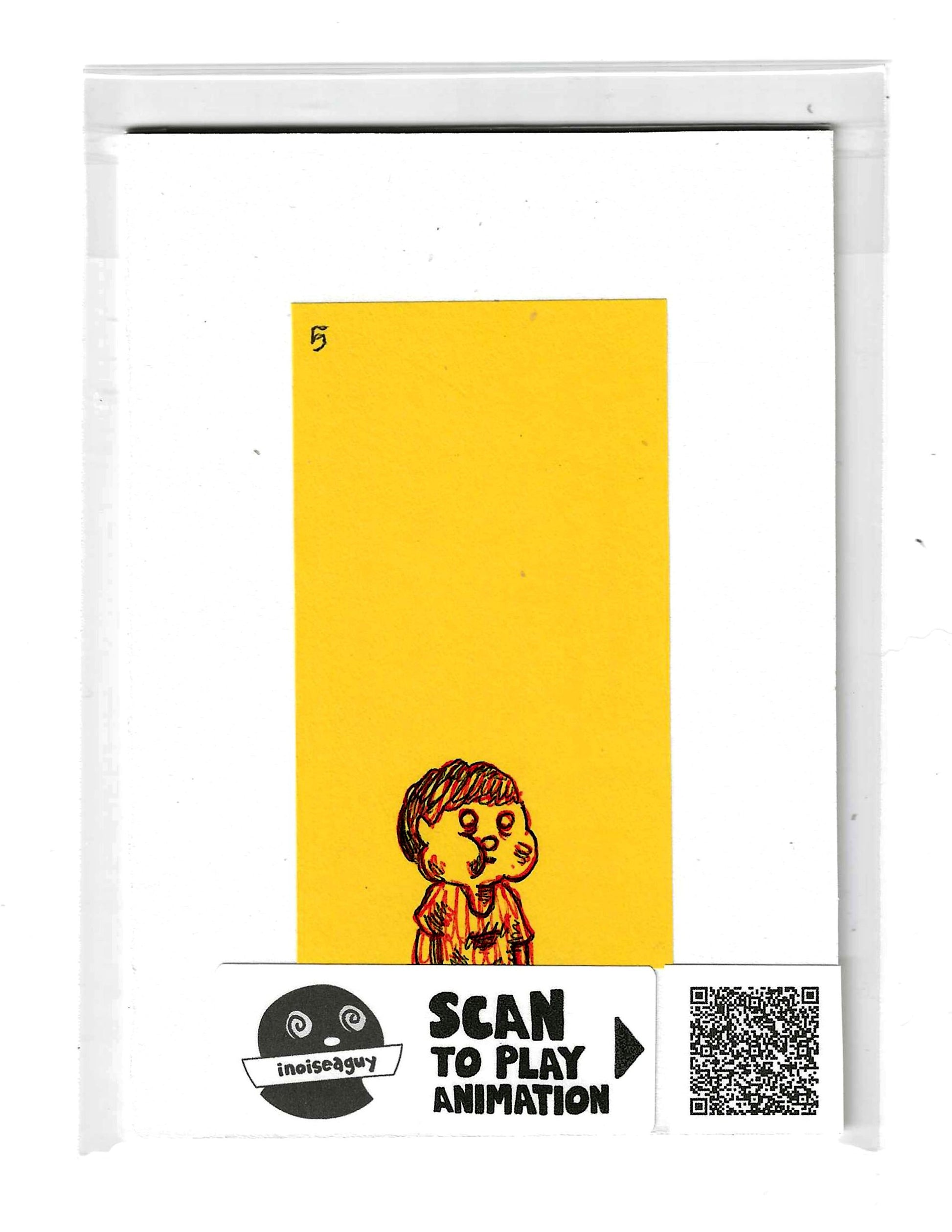 Cel from the traditional animated gif titled, Spicy Ramen Burps. Published in October 2025 on GIPHY.com. This cel is pasted on a 6"x4.25" matting board and protected by a plastic sleeve. On the sleeve is a label for the businesses social media and a unique QR code for the animation, that when scanned will display the animation on your smartphone. There is also an extra label and QR code inside the small yellow envelope in the cel's gatefold.