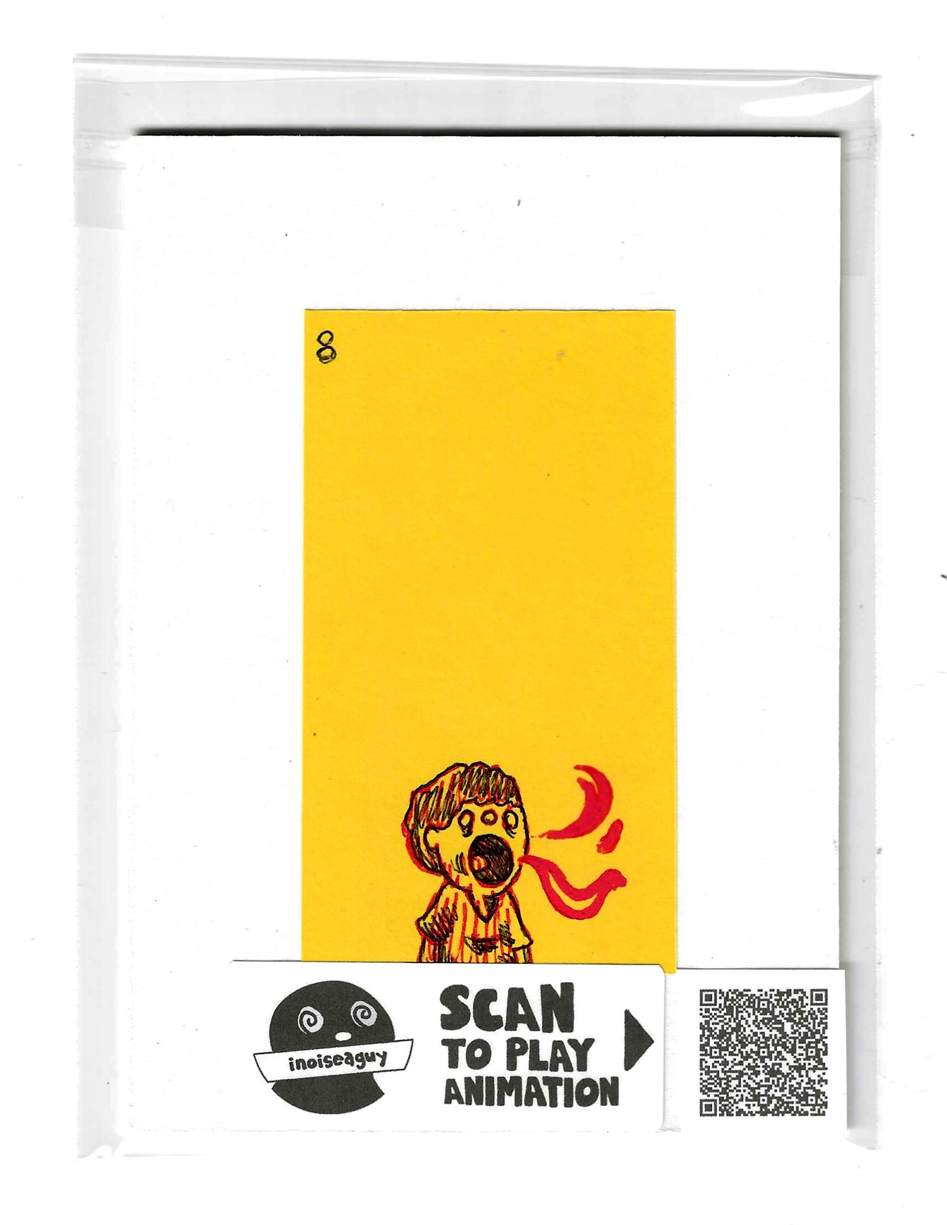 Cel from the traditional animated gif titled, Spicy Ramen Burps. Published in October 2025 on GIPHY.com. This cel is pasted on a 6"x4.25" matting board and protected by a plastic sleeve. On the sleeve is a label for the businesses social media and a unique QR code for the animation, that when scanned will display the animation on your smartphone. There is also an extra label and QR code inside the small yellow envelope in the cel's gatefold.