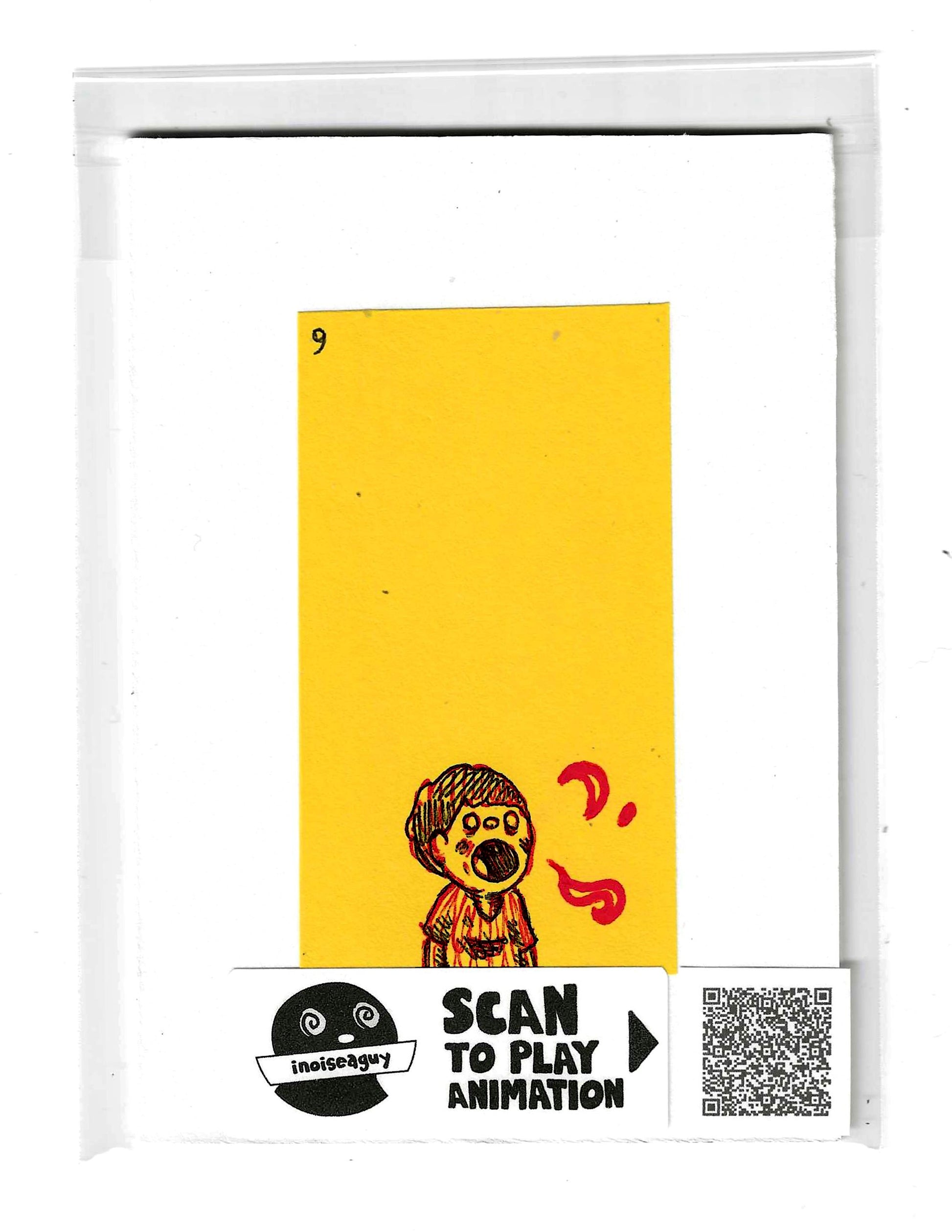 Cel from the traditional animated gif titled, Spicy Ramen Burps. Published in October 2025 on GIPHY.com. This cel is pasted on a 6"x4.25" matting board and protected by a plastic sleeve. On the sleeve is a label for the businesses social media and a unique QR code for the animation, that when scanned will display the animation on your smartphone. There is also an extra label and QR code inside the small yellow envelope in the cel's gatefold.