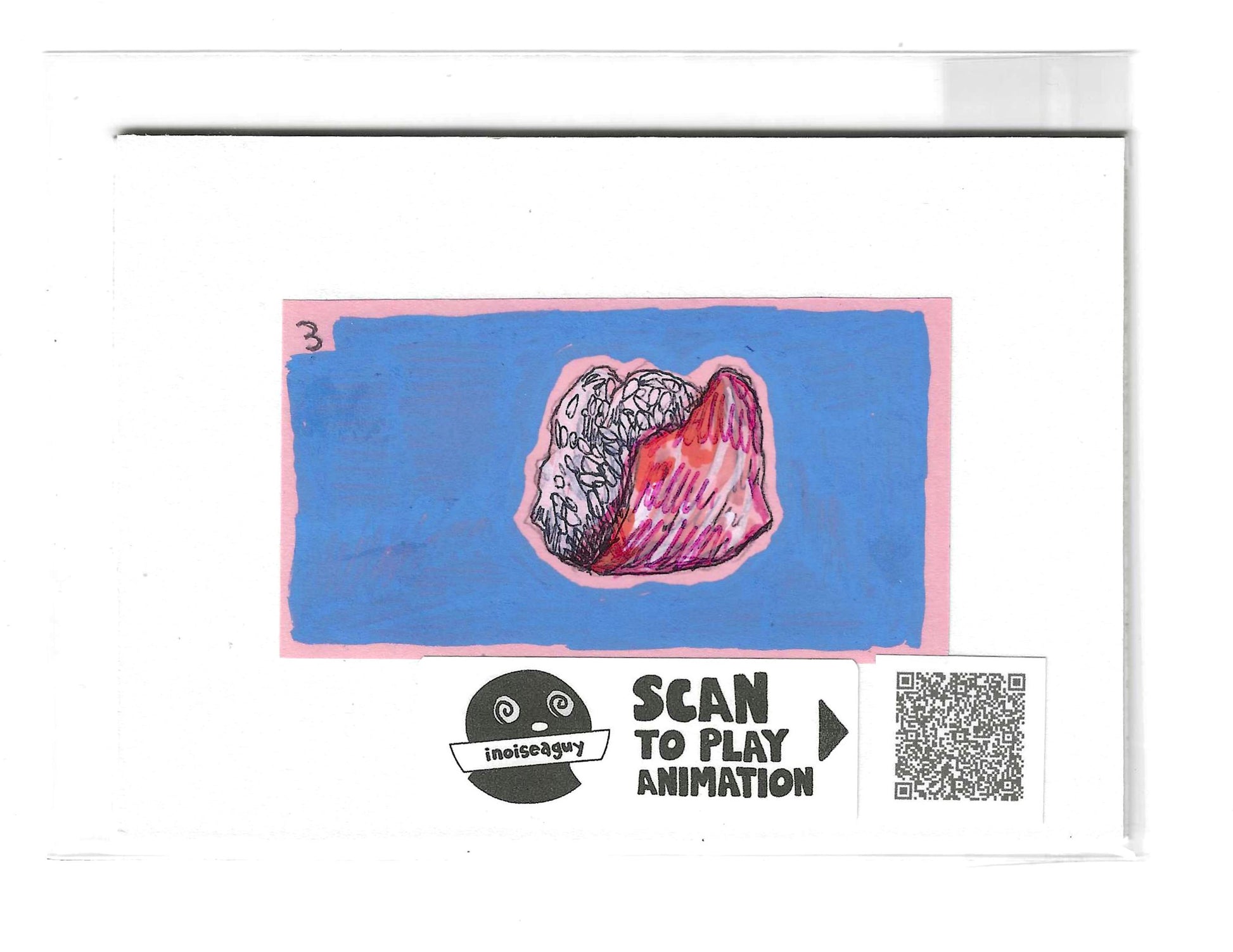 Cel from the traditional animated gif titled, Sushi. Published in October 2025 on GIPHY.com. This cel is pasted on a 6"x4.25" matting board and protected by a plastic sleeve. On the sleeve is a label for the businesses social media and a unique QR code for the animation, that when scanned will display the animation on your smartphone. There is also an extra label and QR code inside the small yellow envelope in the cel's gatefold.