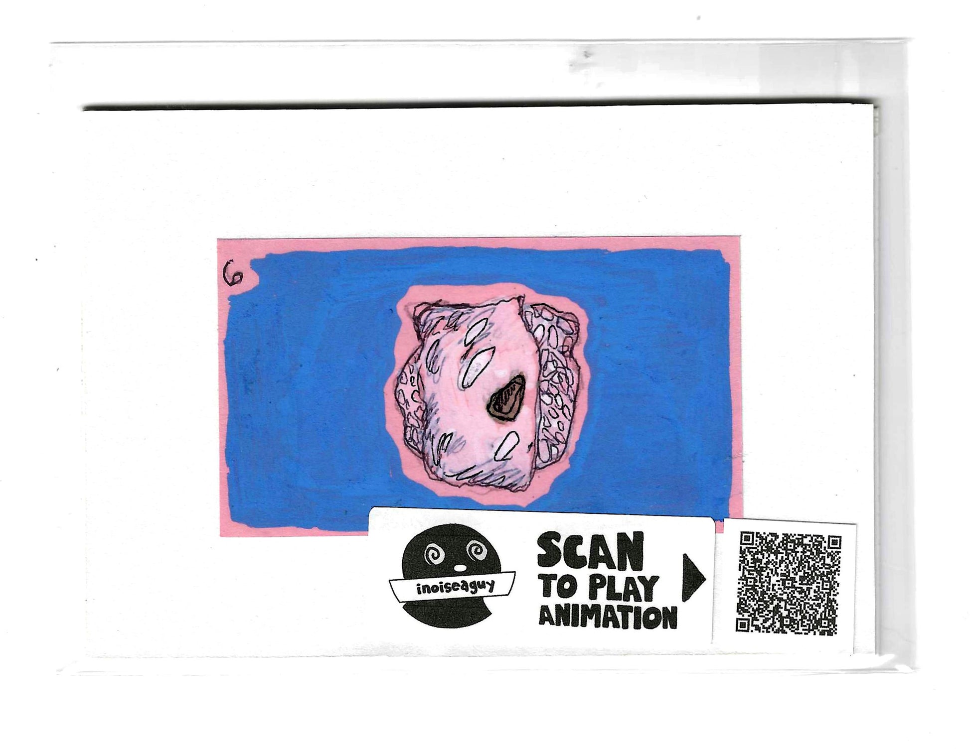 Cel from the traditional animated gif titled, Sushi. Published in October 2025 on GIPHY.com. This cel is pasted on a 6"x4.25" matting board and protected by a plastic sleeve. On the sleeve is a label for the businesses social media and a unique QR code for the animation, that when scanned will display the animation on your smartphone. There is also an extra label and QR code inside the small yellow envelope in the cel's gatefold.