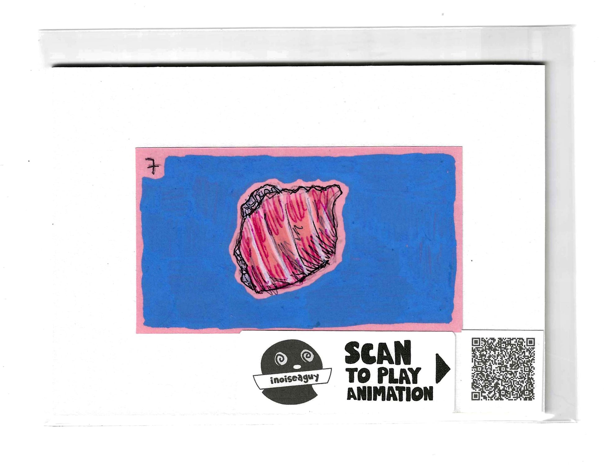 Cel from the traditional animated gif titled, Sushi. Published in October 2025 on GIPHY.com. This cel is pasted on a 6"x4.25" matting board and protected by a plastic sleeve. On the sleeve is a label for the businesses social media and a unique QR code for the animation, that when scanned will display the animation on your smartphone. There is also an extra label and QR code inside the small yellow envelope in the cel's gatefold.