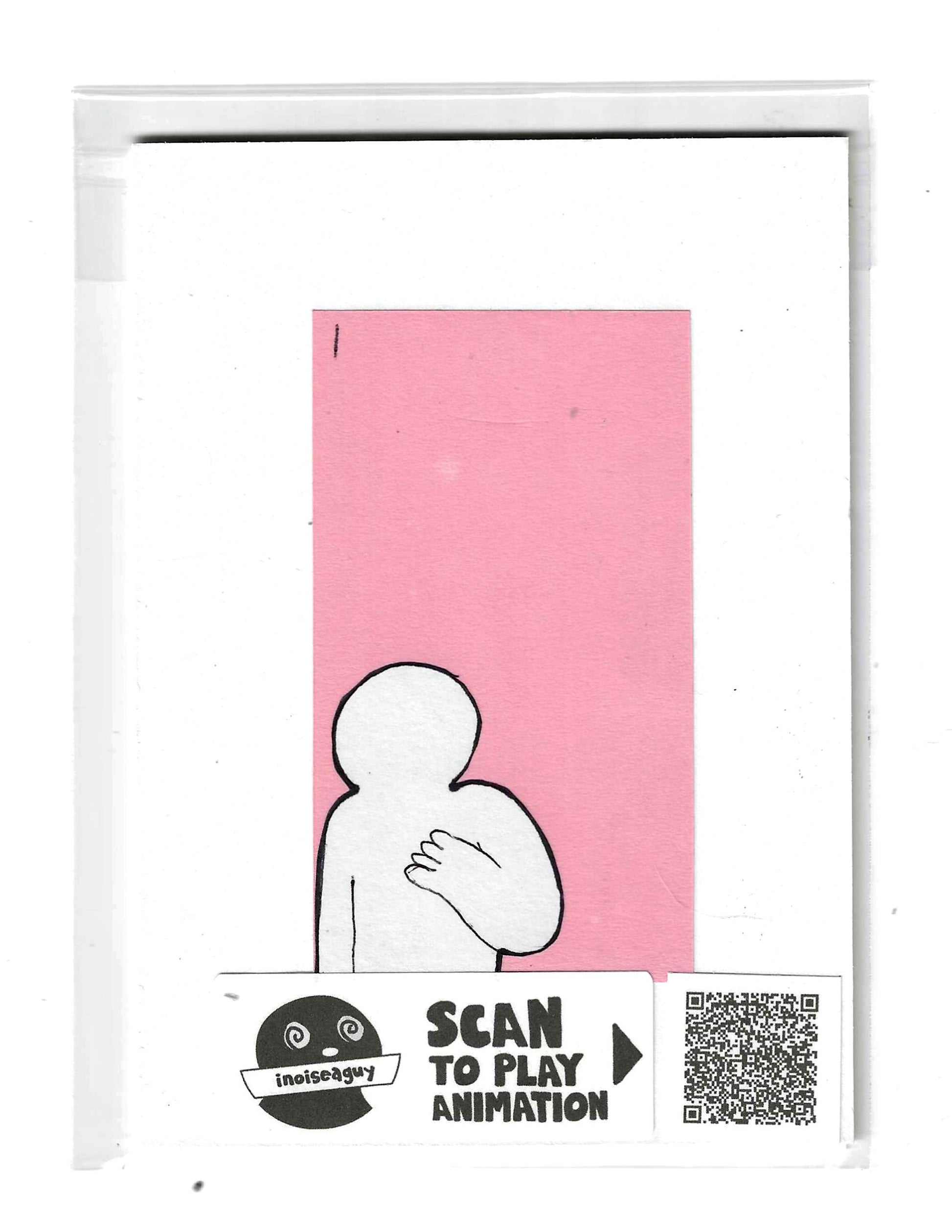 Cel from the traditional animated gif titled, Tar. Published in July 2025 on GIPHY.com. This cel is pasted on a 6"x4.25" matting board and protected by a plastic sleeve. On the sleeve is a label for the businesses social media and a unique QR code for the animation, that when scanned will display the animation on your smartphone. There is also an extra label and QR code inside the small yellow envelope on the backside of the cel.