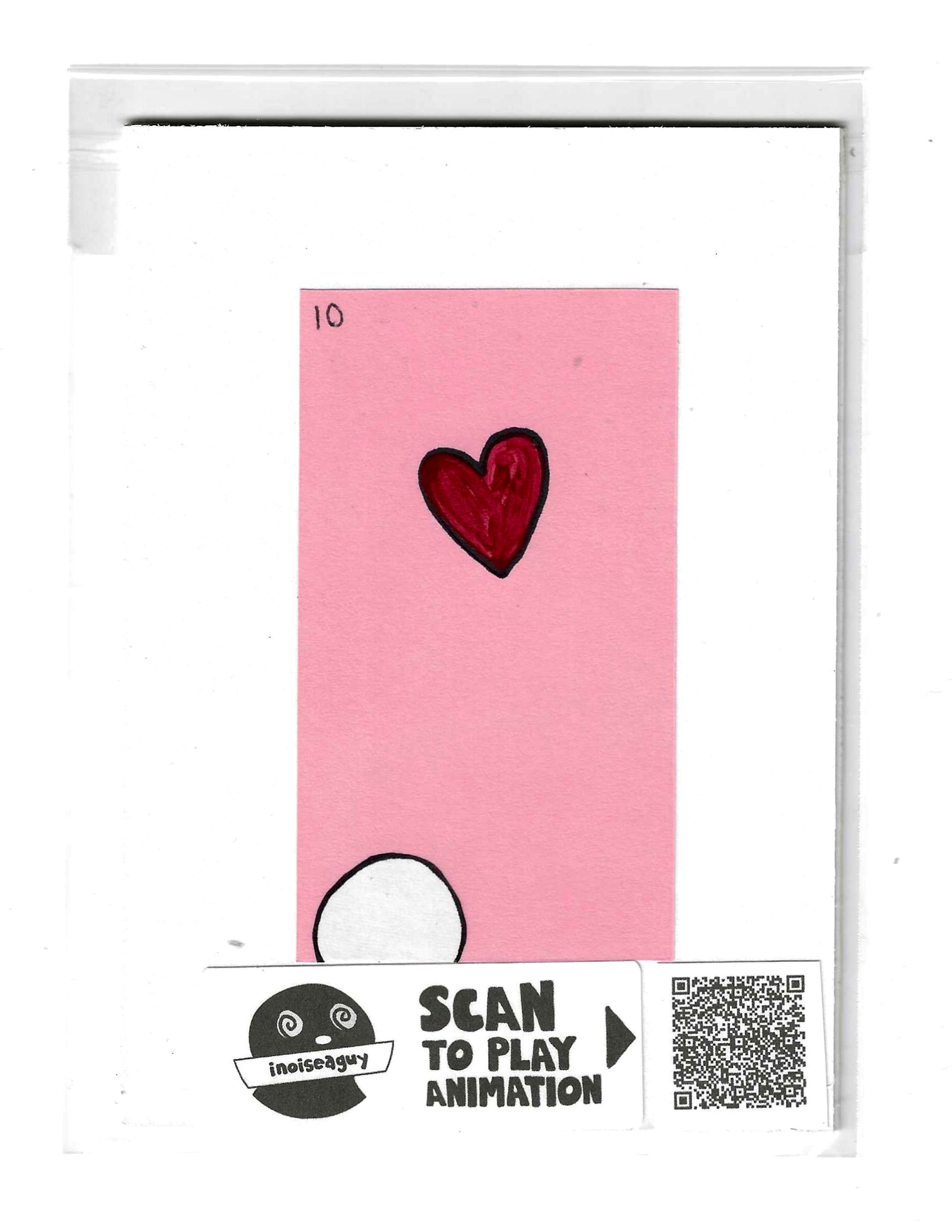 Cel from the traditional animated gif titled, Tar. Published in July 2025 on GIPHY.com. This cel is pasted on a 6"x4.25" matting board and protected by a plastic sleeve. On the sleeve is a label for the businesses social media and a unique QR code for the animation, that when scanned will display the animation on your smartphone. There is also an extra label and QR code inside the small yellow envelope on the backside of the cel.