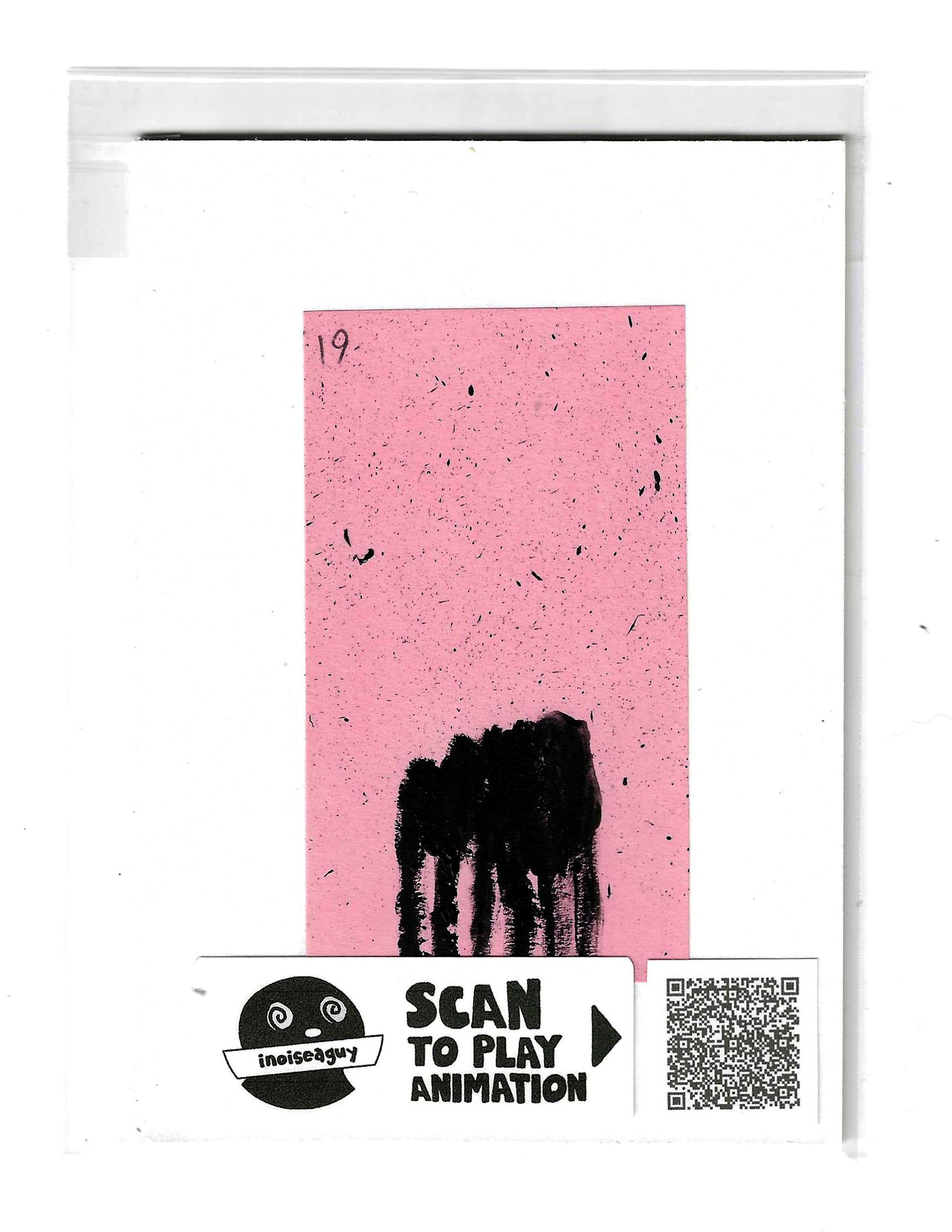 Cel from the traditional animated gif titled, Tar. Published in July 2025 on GIPHY.com. This cel is pasted on a 6"x4.25" matting board and protected by a plastic sleeve. On the sleeve is a label for the businesses social media and a unique QR code for the animation, that when scanned will display the animation on your smartphone. There is also an extra label and QR code inside the small yellow envelope on the backside of the cel.