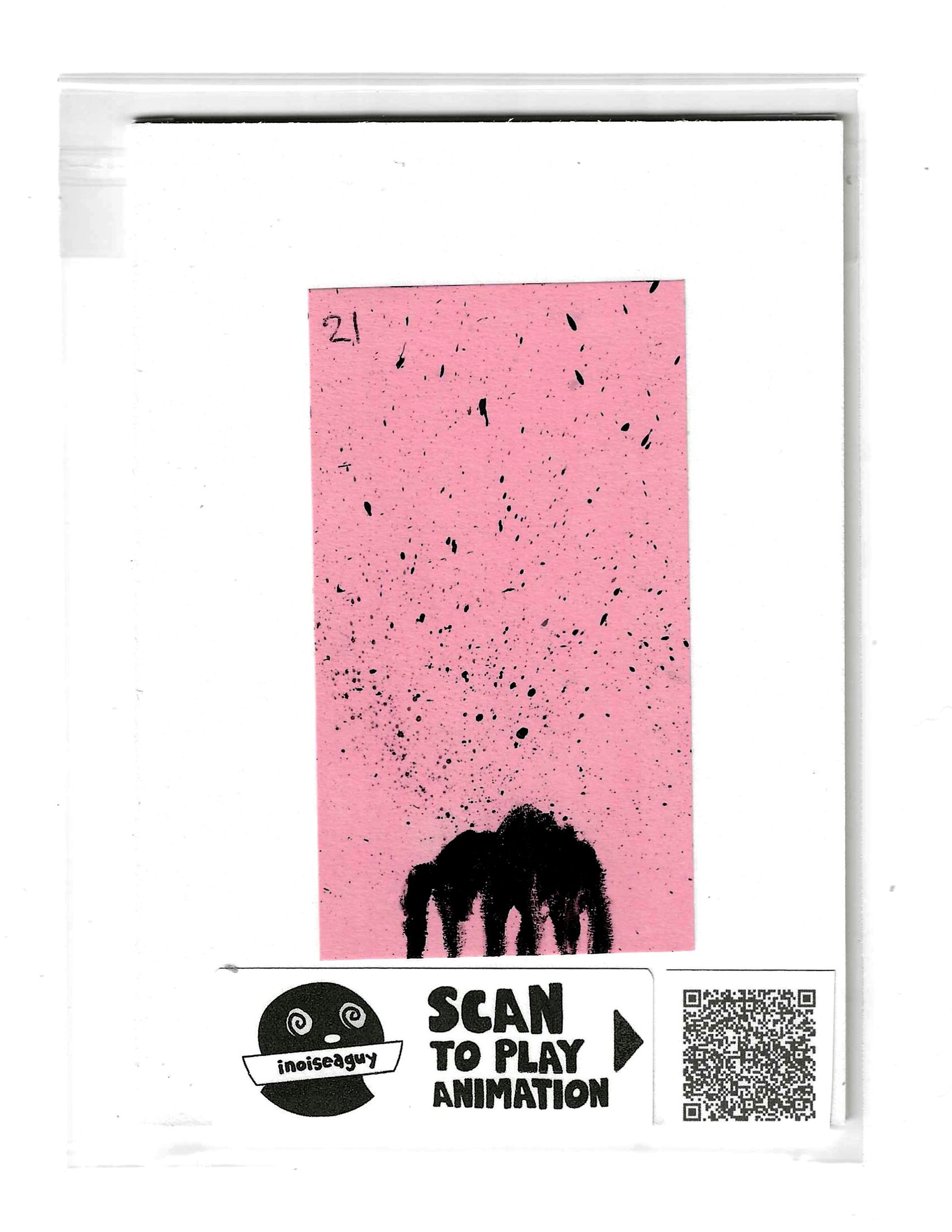 Cel from the traditional animated gif titled, Tar. Published in July 2025 on GIPHY.com. This cel is pasted on a 6"x4.25" matting board and protected by a plastic sleeve. On the sleeve is a label for the businesses social media and a unique QR code for the animation, that when scanned will display the animation on your smartphone. There is also an extra label and QR code inside the small yellow envelope on the backside of the cel.