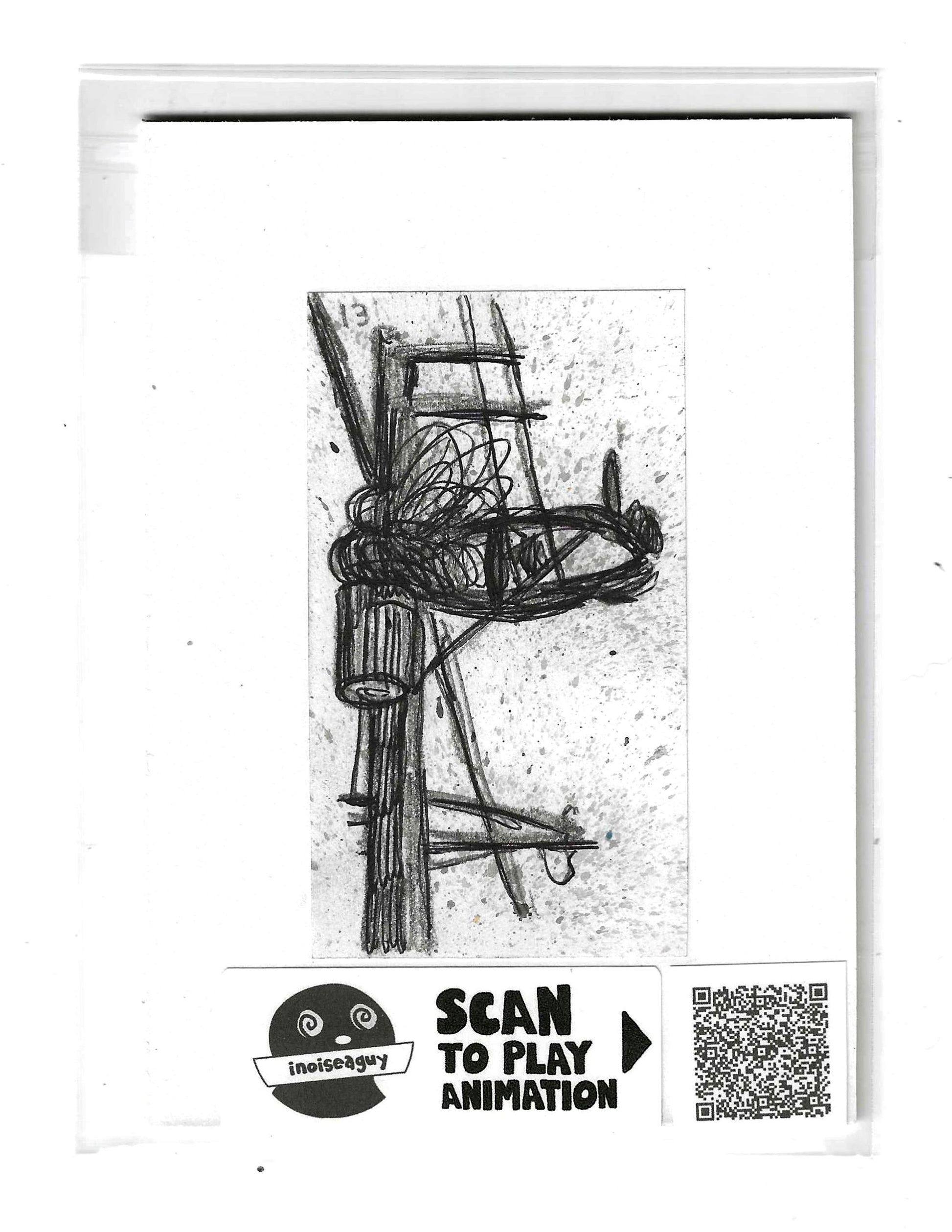 Cel from the traditional animated gif titled, Tokyo Electric Wires. Published in October 2025 on GIPHY.com. This cel is pasted on a 6"x4.25" matting board and protected by a plastic sleeve. On the sleeve is a label for the businesses social media and a unique QR code for the animation, that when scanned will display the animation on your smartphone. There is also an extra label and QR code inside the small yellow envelope in the cel's gatefold.