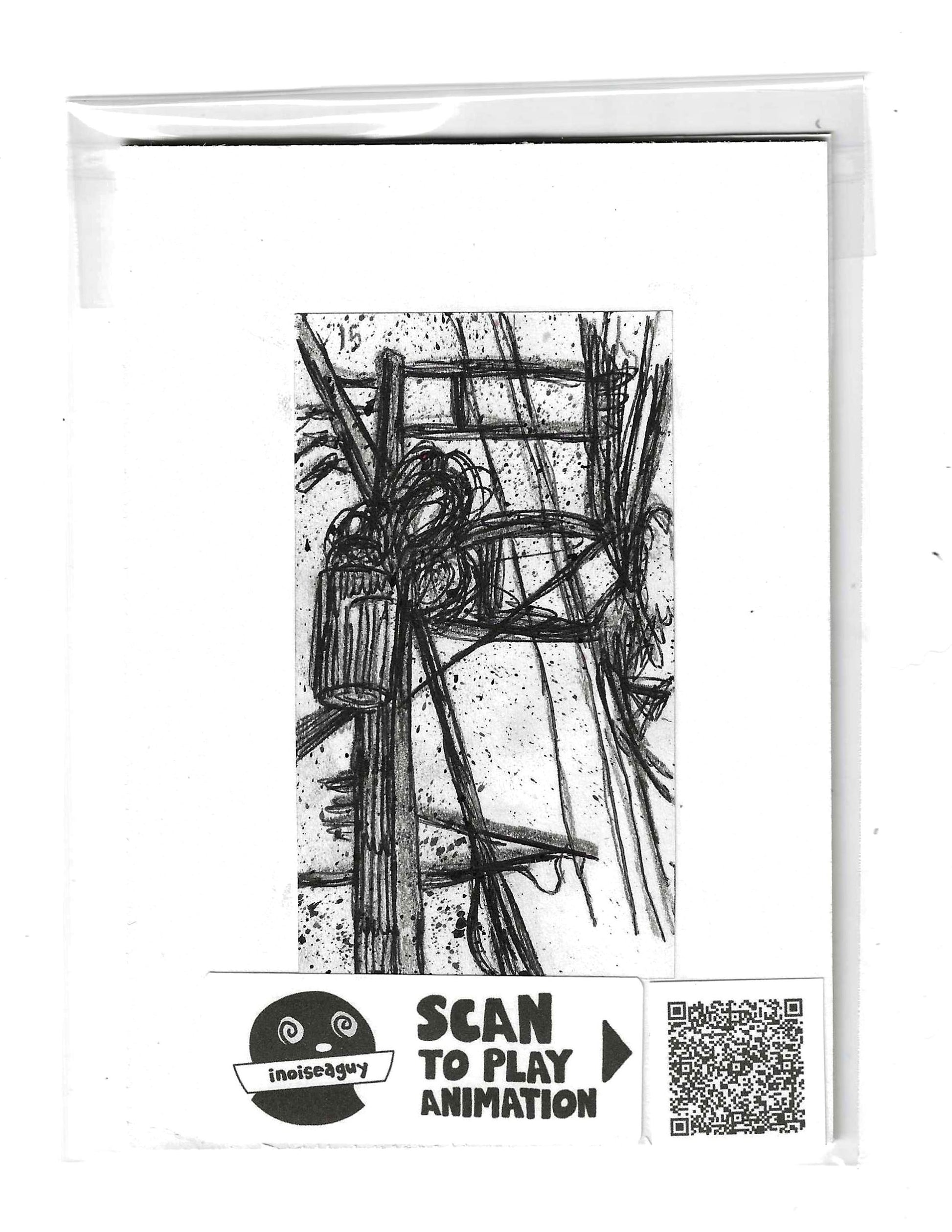 Cel from the traditional animated gif titled, Tokyo Electric Wires. Published in October 2025 on GIPHY.com. This cel is pasted on a 6"x4.25" matting board and protected by a plastic sleeve. On the sleeve is a label for the businesses social media and a unique QR code for the animation, that when scanned will display the animation on your smartphone. There is also an extra label and QR code inside the small yellow envelope in the cel's gatefold.