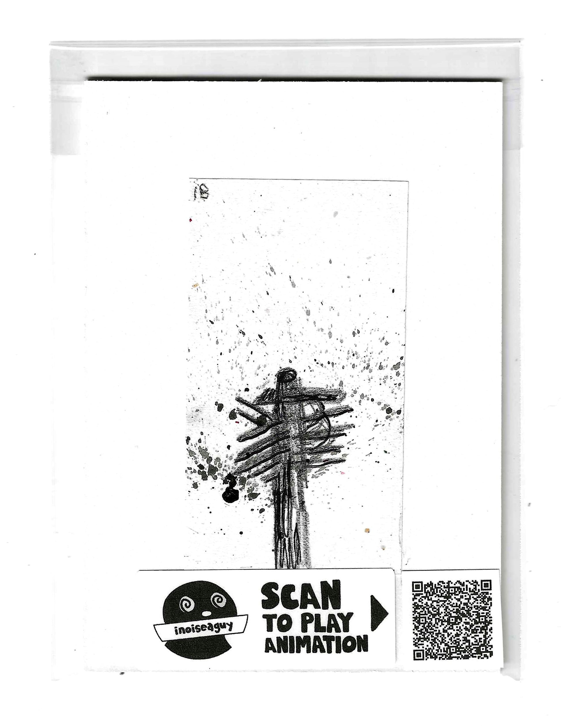 Cel from the traditional animated gif titled, Tokyo Electric Wires. Published in October 2025 on GIPHY.com. This cel is pasted on a 6"x4.25" matting board and protected by a plastic sleeve. On the sleeve is a label for the businesses social media and a unique QR code for the animation, that when scanned will display the animation on your smartphone. There is also an extra label and QR code inside the small yellow envelope in the cel's gatefold.
