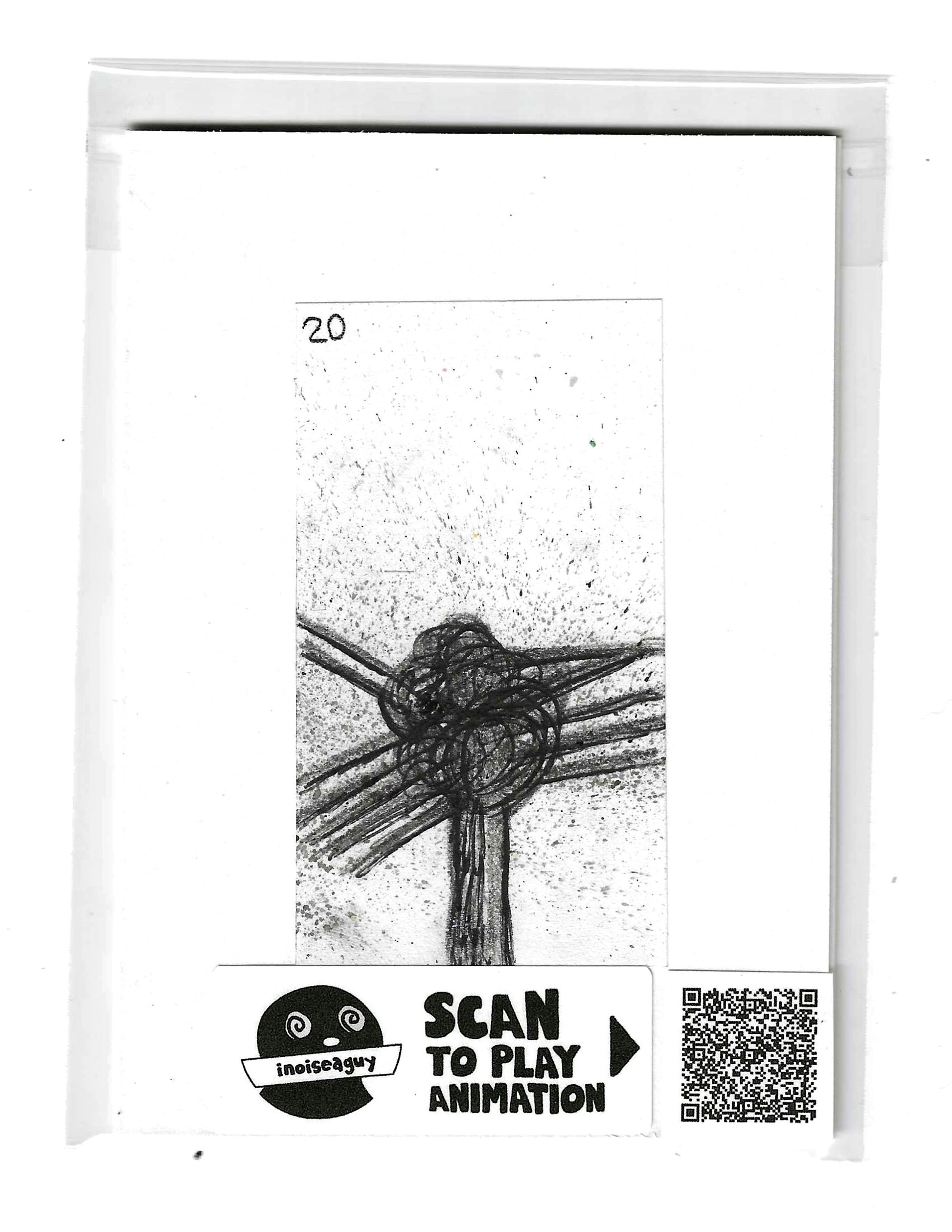 Cel from the traditional animated gif titled, Tokyo Electric Wires. Published in October 2025 on GIPHY.com. This cel is pasted on a 6"x4.25" matting board and protected by a plastic sleeve. On the sleeve is a label for the businesses social media and a unique QR code for the animation, that when scanned will display the animation on your smartphone. There is also an extra label and QR code inside the small yellow envelope in the cel's gatefold.