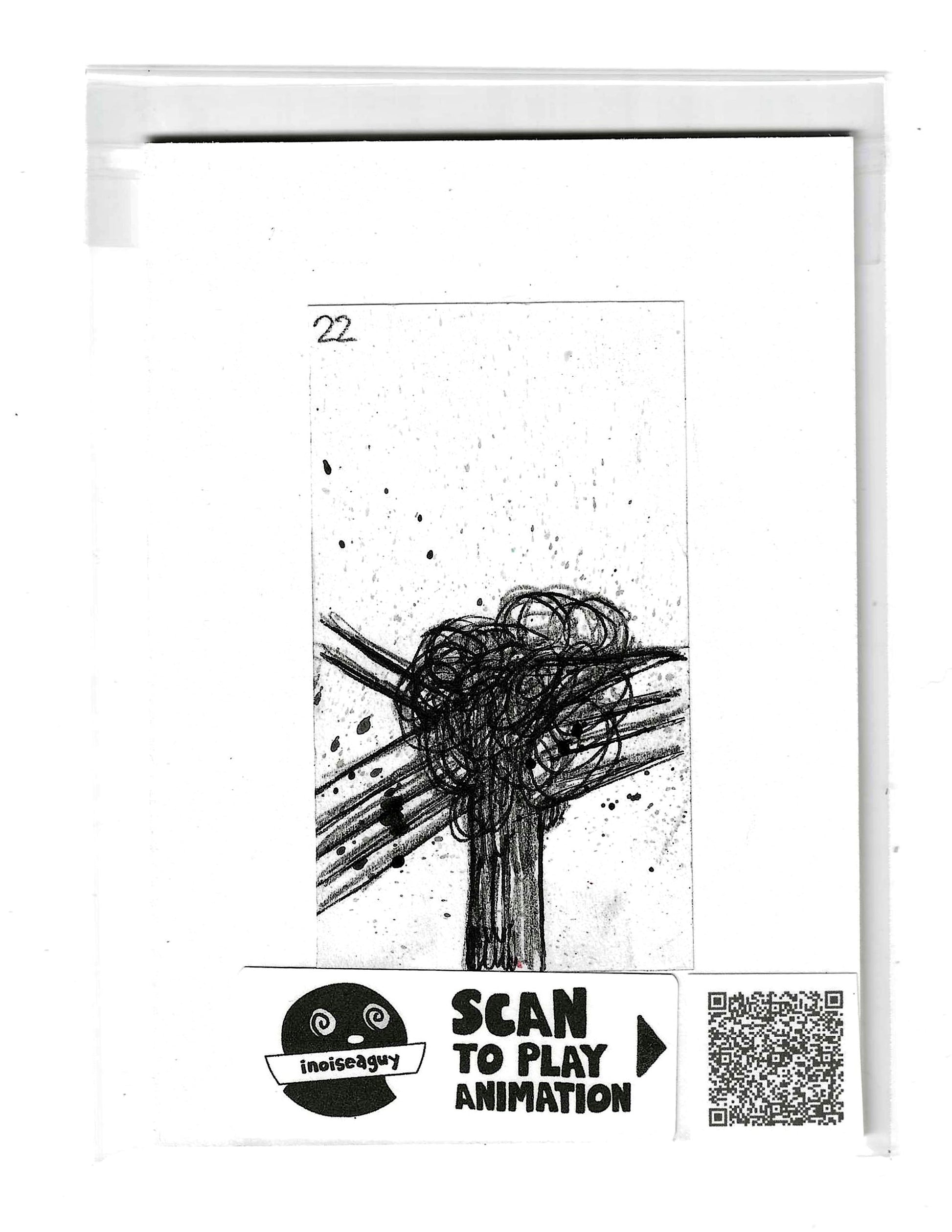 Cel from the traditional animated gif titled, Tokyo Electric Wires. Published in October 2025 on GIPHY.com. This cel is pasted on a 6"x4.25" matting board and protected by a plastic sleeve. On the sleeve is a label for the businesses social media and a unique QR code for the animation, that when scanned will display the animation on your smartphone. There is also an extra label and QR code inside the small yellow envelope in the cel's gatefold.