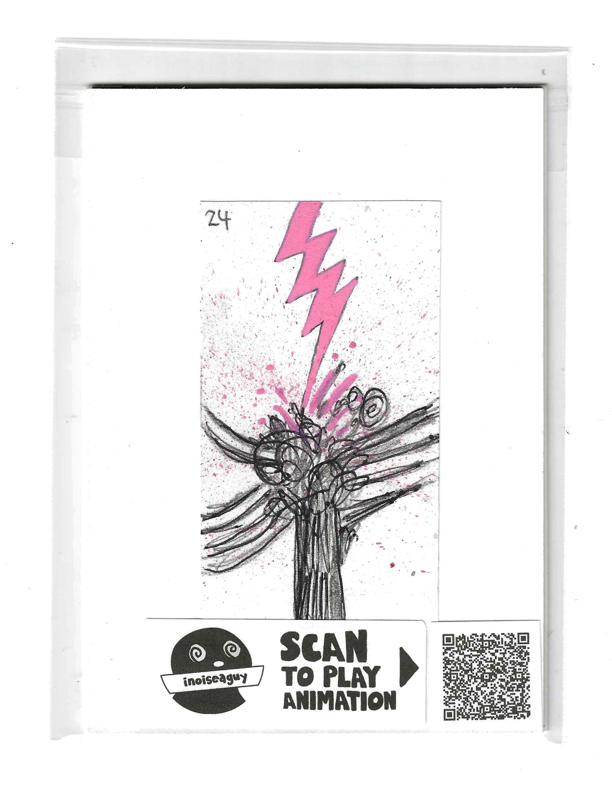 Cel from the traditional animated gif titled, Tokyo Electric Wires. Published in October 2025 on GIPHY.com. This cel is pasted on a 6"x4.25" matting board and protected by a plastic sleeve. On the sleeve is a label for the businesses social media and a unique QR code for the animation, that when scanned will display the animation on your smartphone. There is also an extra label and QR code inside the small yellow envelope in the cel's gatefold.