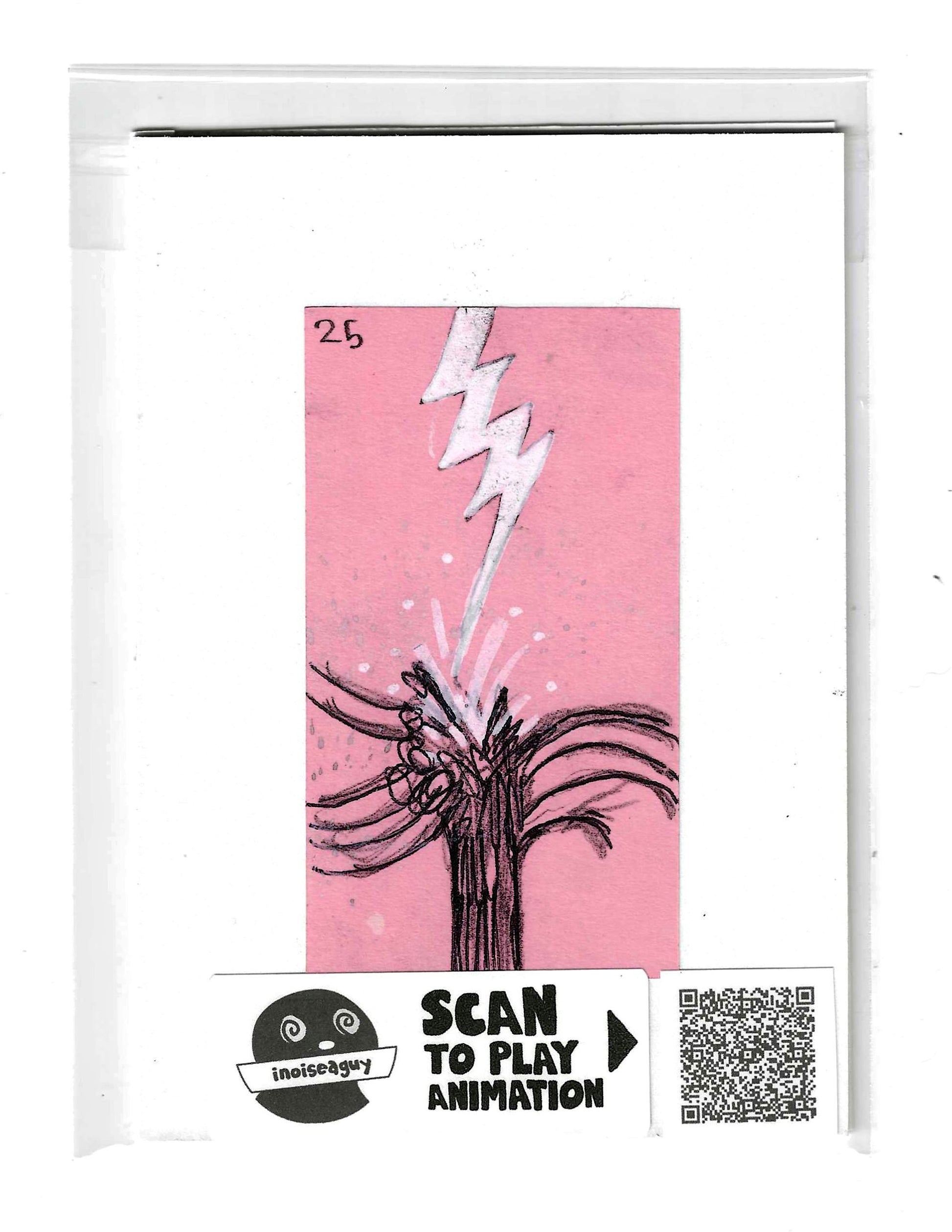 Cel from the traditional animated gif titled, Tokyo Electric Wires. Published in October 2025 on GIPHY.com. This cel is pasted on a 6"x4.25" matting board and protected by a plastic sleeve. On the sleeve is a label for the businesses social media and a unique QR code for the animation, that when scanned will display the animation on your smartphone. There is also an extra label and QR code inside the small yellow envelope in the cel's gatefold.